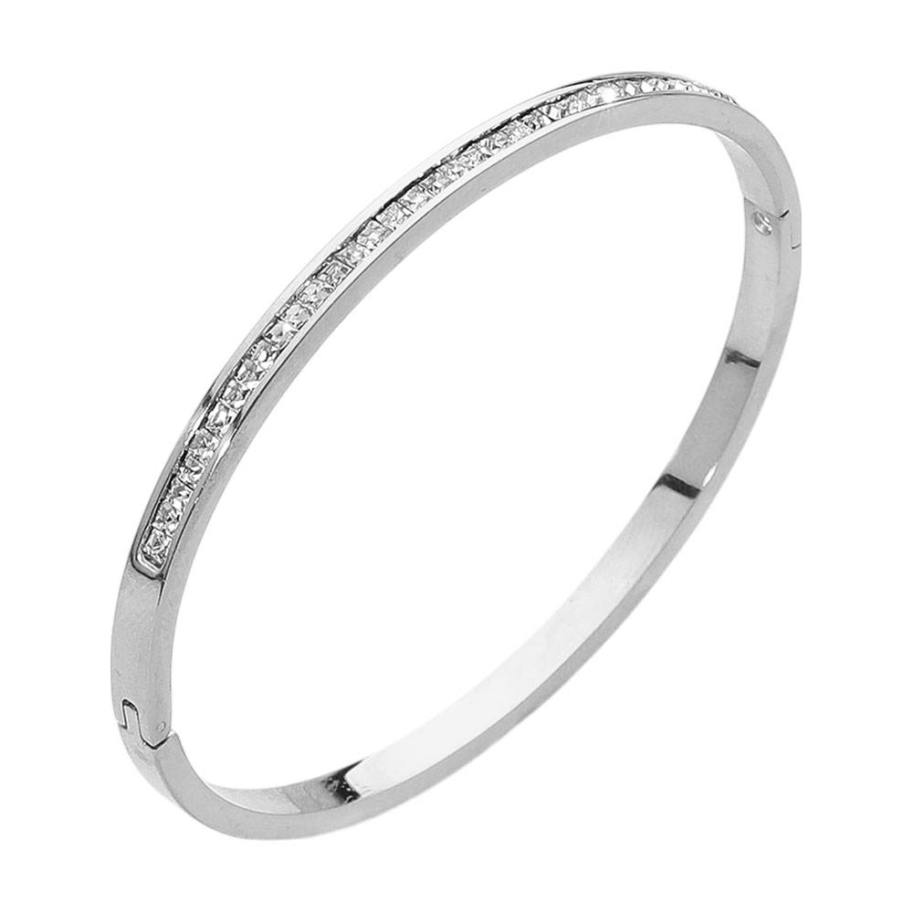 Details • Size : 0.2" H, 2.4" D • Hinged Closure • Water Resistant • Sleek hinged bangle bracelet with a row of sparkling rhinestone accents. Classic and elegant design perfect for stacking or wearing solo to add a refined touch to day or evening looks. • Stainless Steel