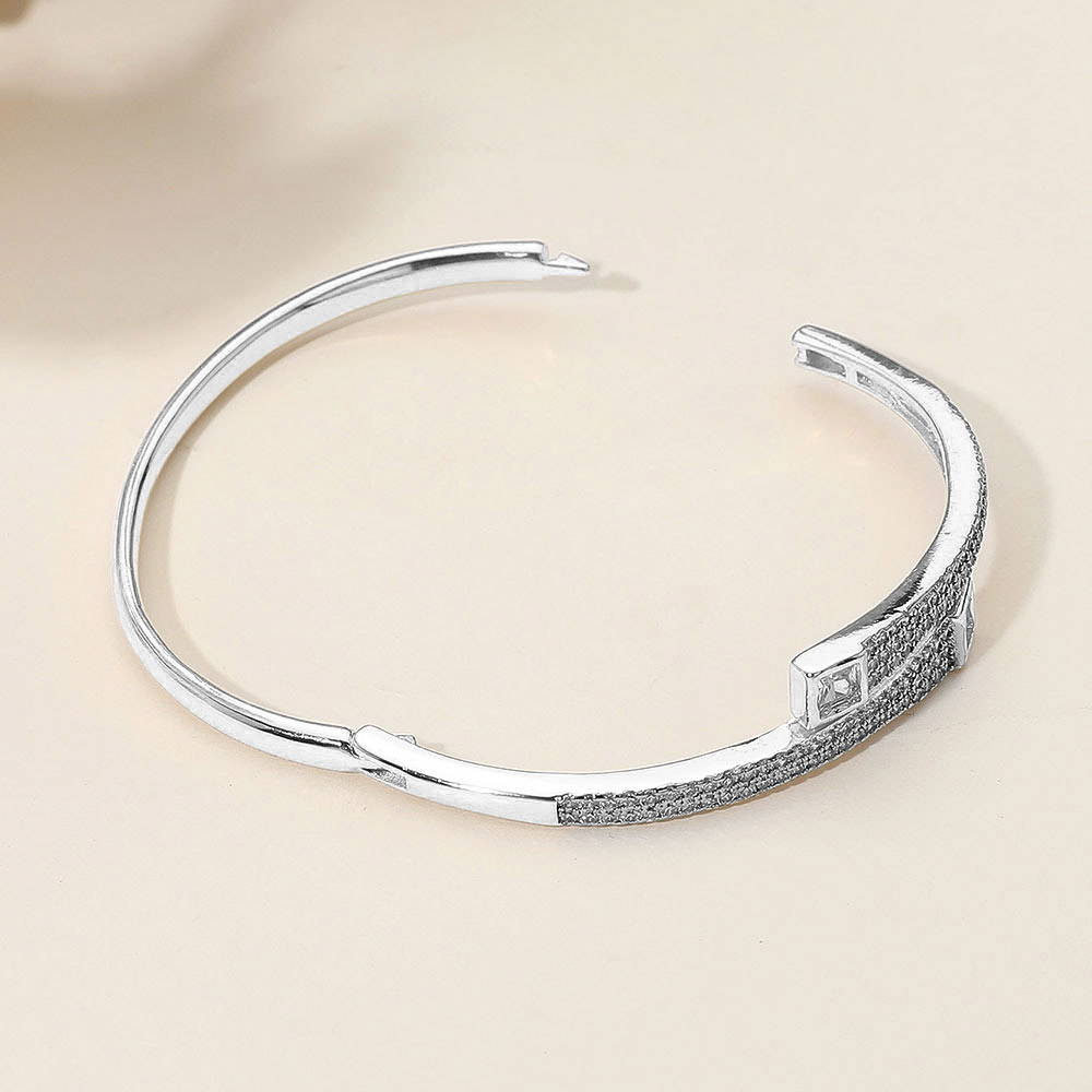 Details • Size : 0.4" H, 2.4" D • Hinged Closure • Water Resistant • Sleek and modern bangle bracelet featuring a refined pave design and a distinctive square accent. Perfect for adding a subtle yet sophisticated sparkle to both casual and formal looks, offering timeless elegance for any occasion. • Hypoallergenic • Lead and Nickel Compliant