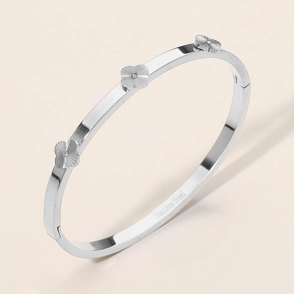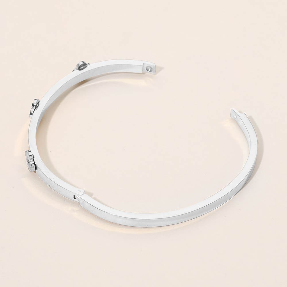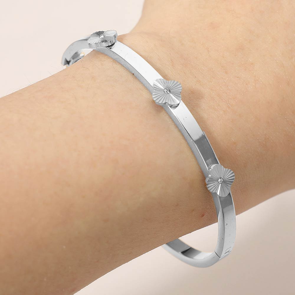 • Elegant hinged bracelet featuring delicate quatrefoil station details accented with subtle cz centers. Designed with a clean, minimalist silhouette, this refined bracelet adds a graceful touch to everyday looks, office outfits, or special occasions while offering comfortable and secure wear.