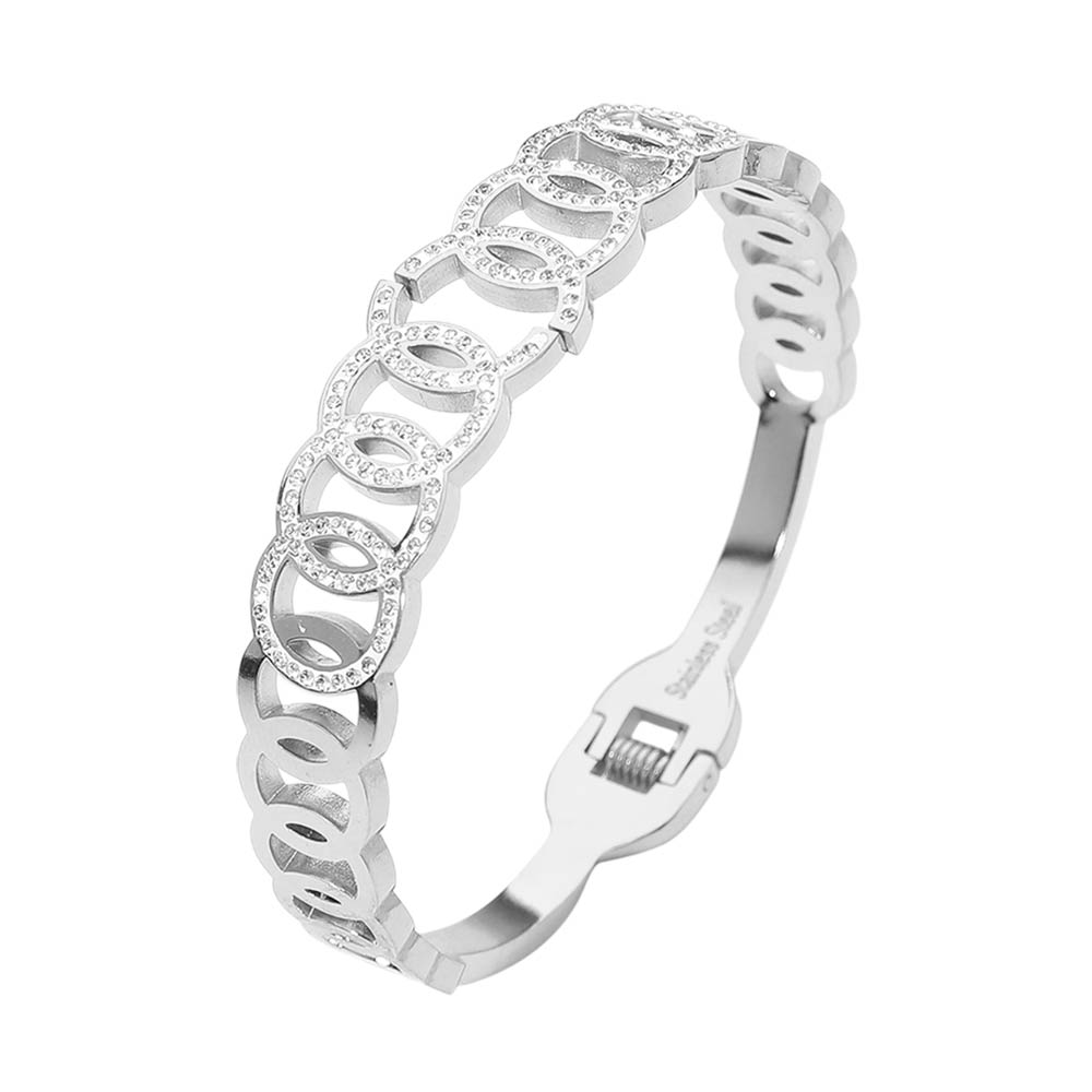 Details • Size : 0.5" H, 2.3" D • Hinged Closure • Sophisticated hinged bracelet designed with layered circle link shapes and sparkling cz accents. This sleek statement piece offers a polished look with easy wear, making it perfect for daily styling, evening outfits, or stacking with other bracelets for a refined, modern finish. • CZ Cubic Zirconia • Stainless Steel