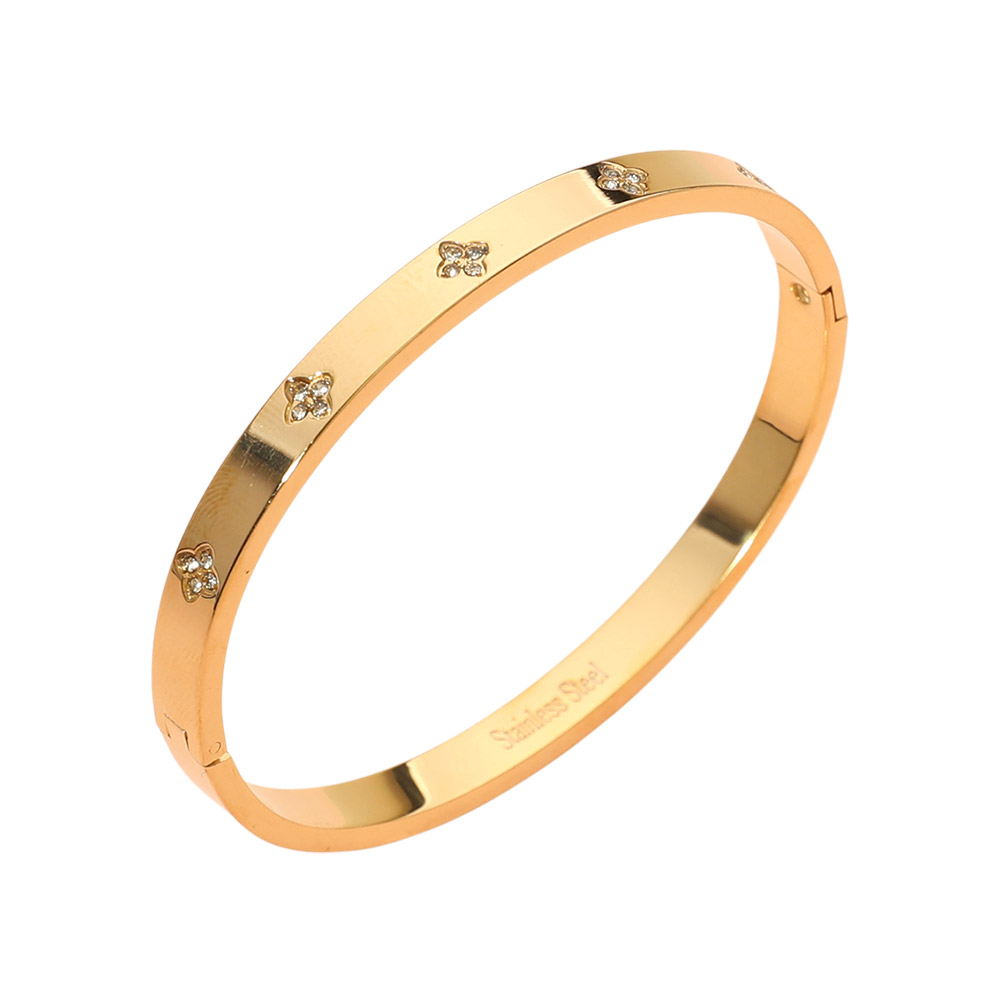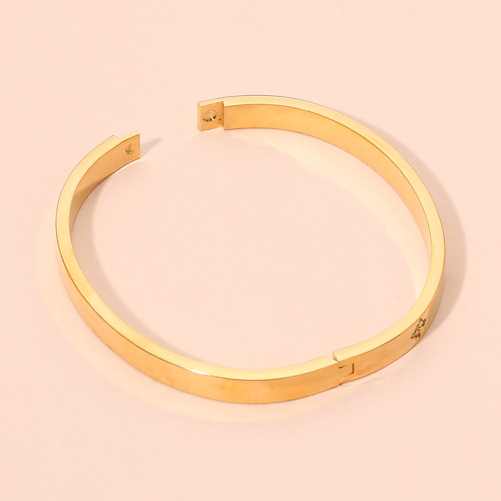 • Minimalist hinged bangle bracelet accented with evenly spaced crystal details for subtle sparkle. Designed with a sleek structured silhouette that layers easily or stands alone, this bracelet offers a refined look suitable for everyday wear, gifting, and modern fashion jewelry collections.
