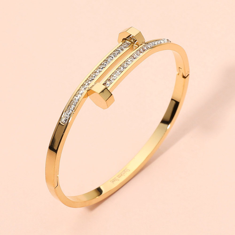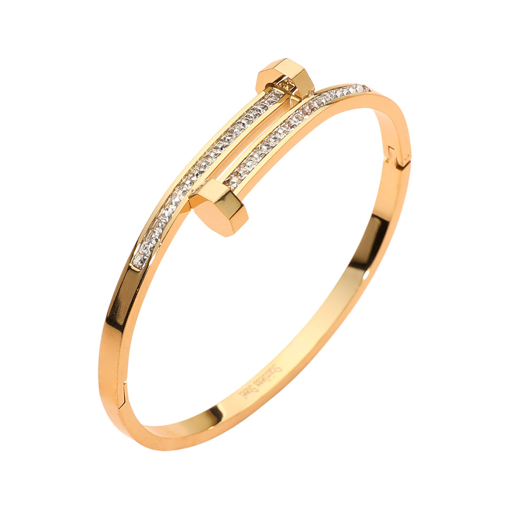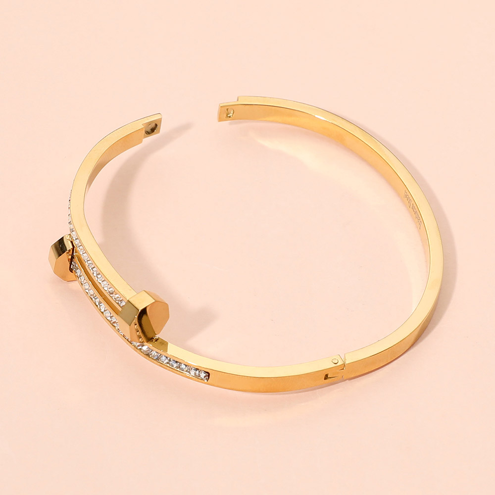 Details • Size : 0.6" H, 2.4" D • Hinged Closure • Statement cuff bracelet featuring a modern nail-inspired silhouette with sparkling crystal accents. Designed with a sleek hinged structure for comfortable wear, this bracelet adds an edgy yet refined touch to everyday outfits, special occasions, and curated fashion jewelry collections. • CZ Cubic Zirconia • Stainless Steel