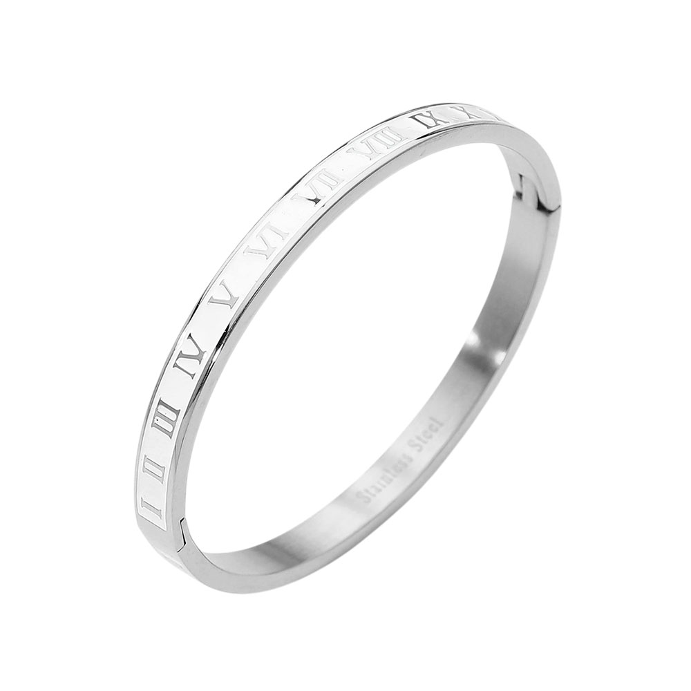 Details • Size : 0.2" H, 3.2" D • Hinged Closure • Elegant hinged bangle bracelet featuring a sleek Roman numeral design for a timeless, modern look. Designed with an easy open-and-close hinge for a secure and comfortable fit. Perfect for everyday wear, stacking with other bangles, or adding a refined accent to curated boutique jewelry collections. • Stainless Steel