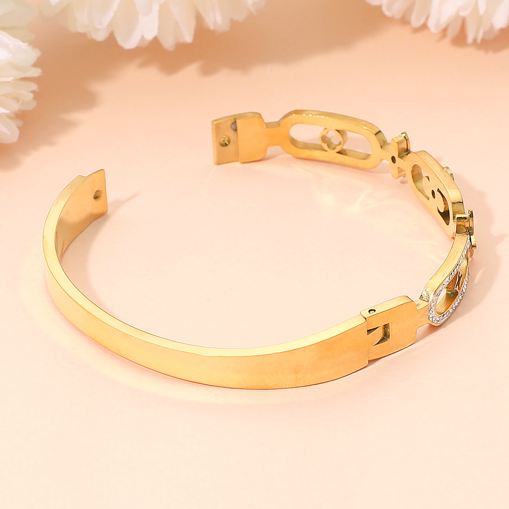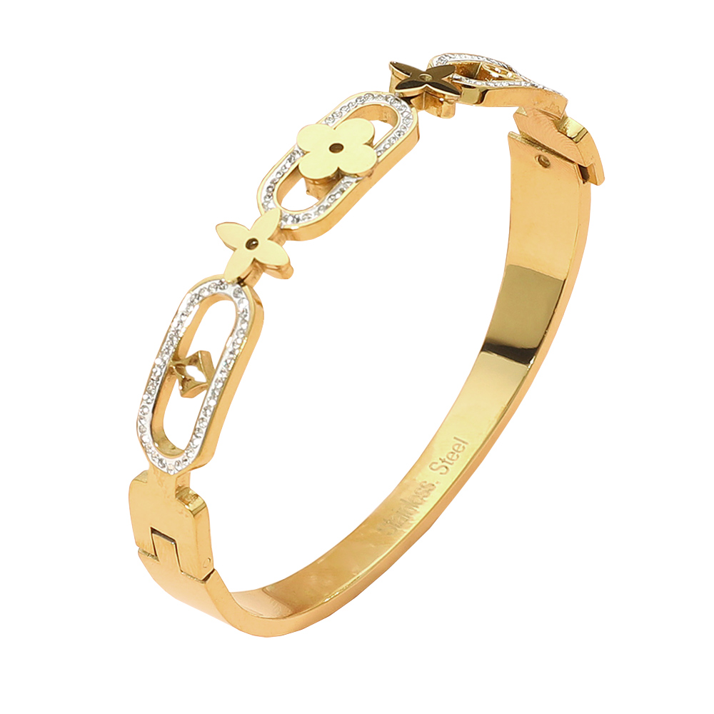 Stainless Steel Geometric Clover Motif CZ Stone Paved Link Hinged Bangle Bracelet