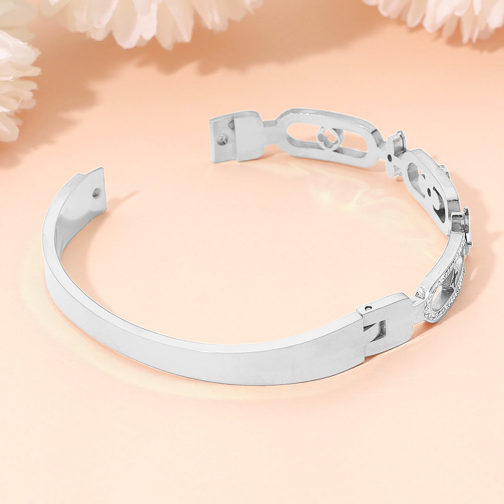 Stainless Steel Geometric Clover Motif CZ Stone Paved Link Hinged Bangle Bracelet