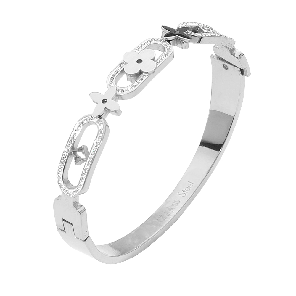 Details • Size : 0.3" H, 2.3" D • Hinged Closure • Chic bangle bracelet featuring a mix of clover motifs and geometric links, highlighted with sparkling crystal details. A sophisticated piece that blends elegance and modern style, making it a versatile accessory for casual or formal occasions. • CZ Cubic Zirconia • Stainless Steel