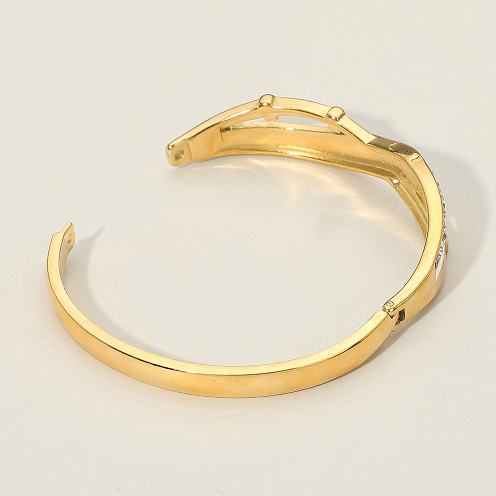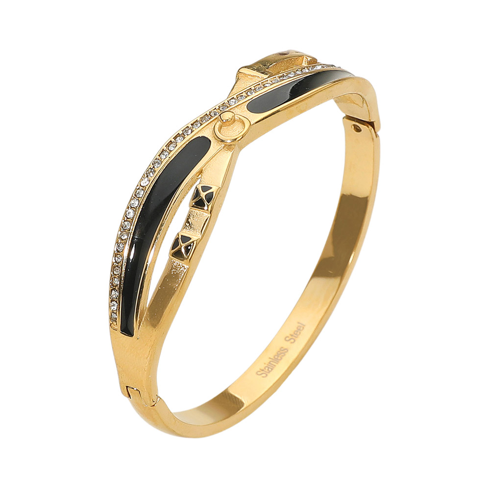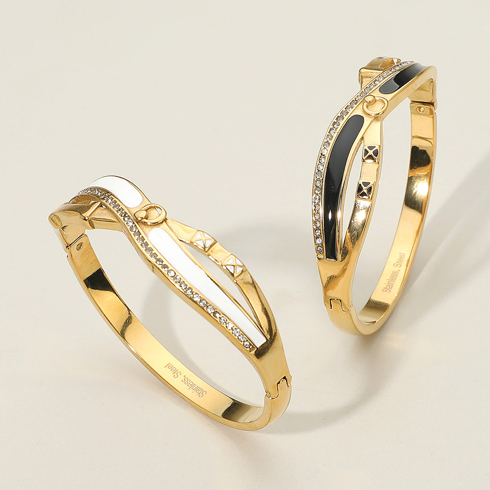 Stainless Steel Geometric CZ Stone Paved Enamel Inlay Accent Hinged Bangle Bracelet