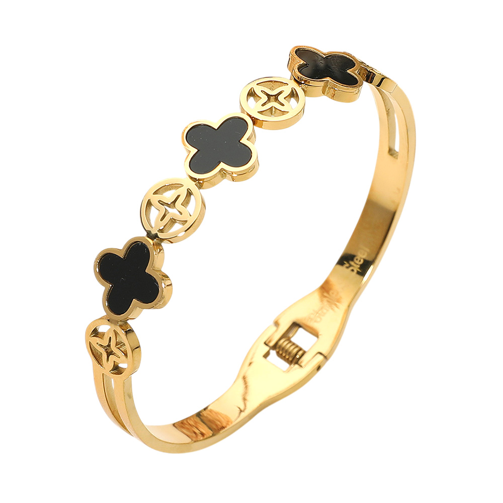 Details • Size : 0.5" H, 2.4" D • Hinged Closure • Add a touch of charm with this quatrefoil hinged bangle bracelet. Featuring alternating filled and open clover motifs, this elegant piece offers a refined look perfect for layering or wearing solo. A stylish bracelet that combines symbolic design with timeless elegance. • Stainless Steel
