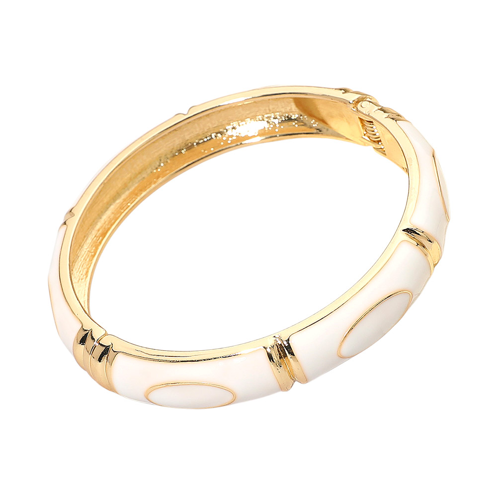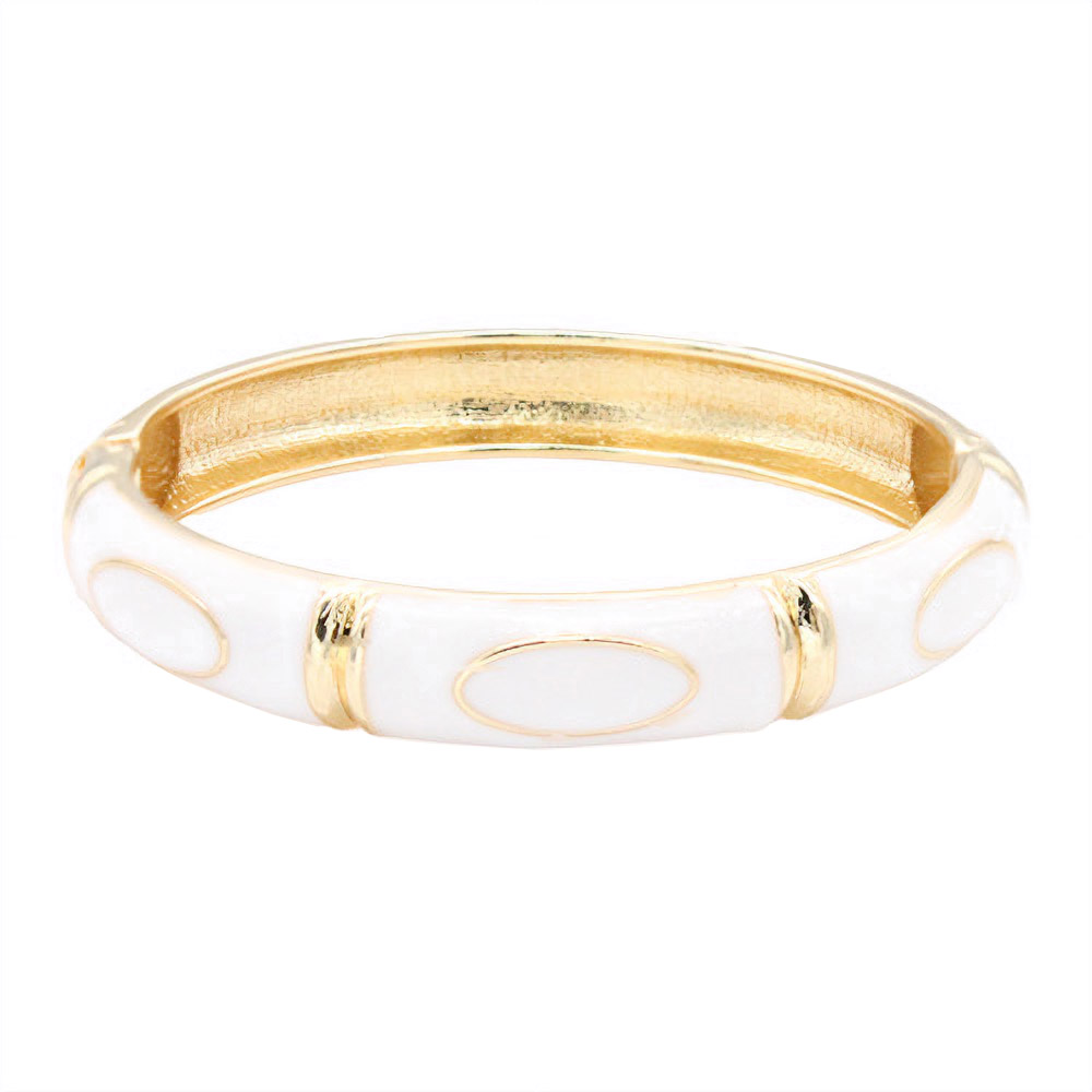 Details • Size : 0.4" H, 2.4" D • Hinged Closure • Elegant enamel bangle bracelet featuring smooth oval accents and a polished hinged design. A timeless statement accessory that adds refined charm to any outfit. Perfect for formal, casual, or workwear styling with a sleek and sophisticated finish. • Lead and Nickel Compliant