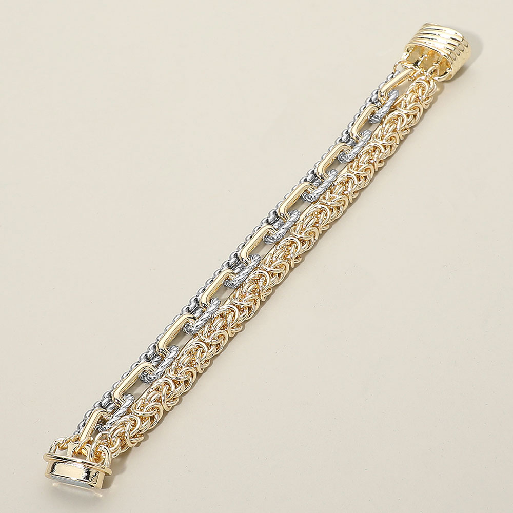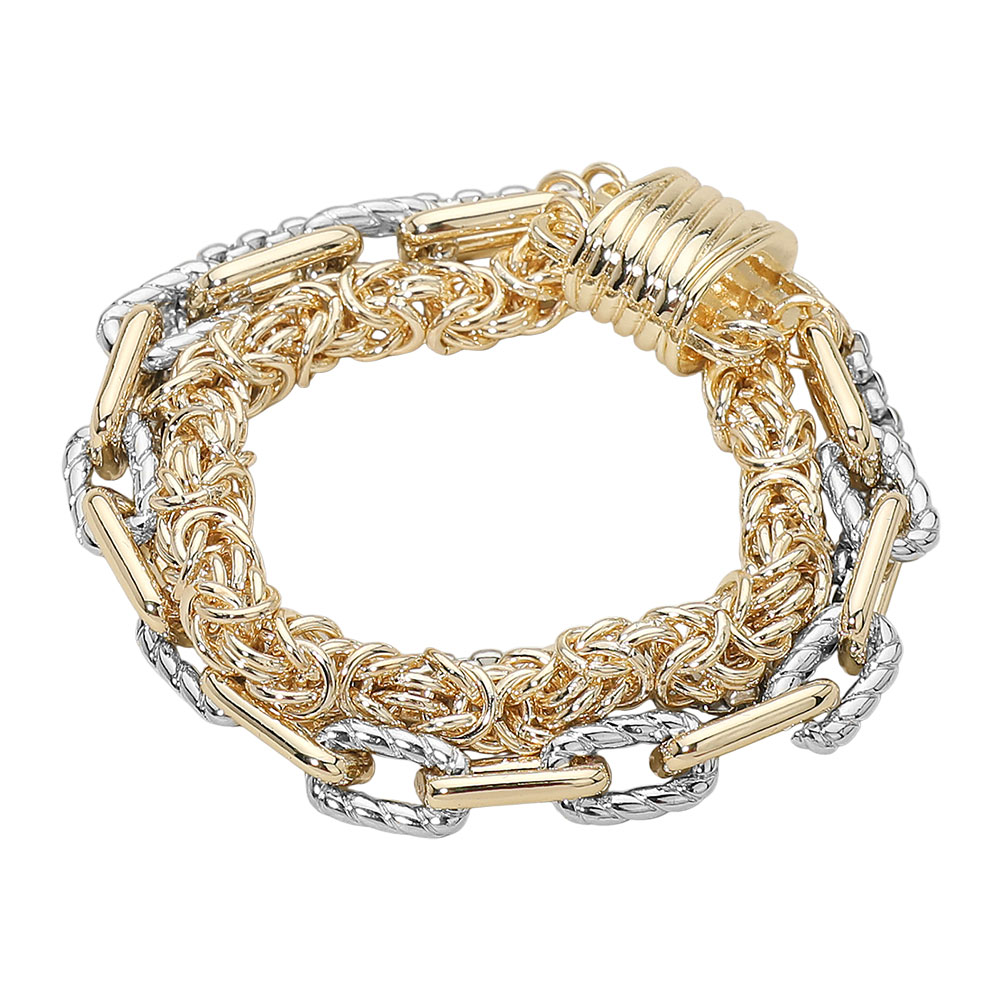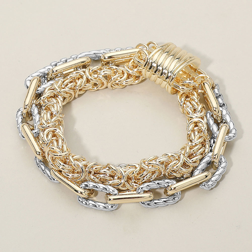 Details • Size : 0.75" H, 7.5" L • Magnetic Closure • Eye-catching layered bracelet featuring mixed chain styles and a secure magnetic closure. Designed for effortless wear, this statement piece adds texture, depth, and modern edge to any outfit, making it perfect for stacking or wearing solo for bold everyday style. • Gold Dipped