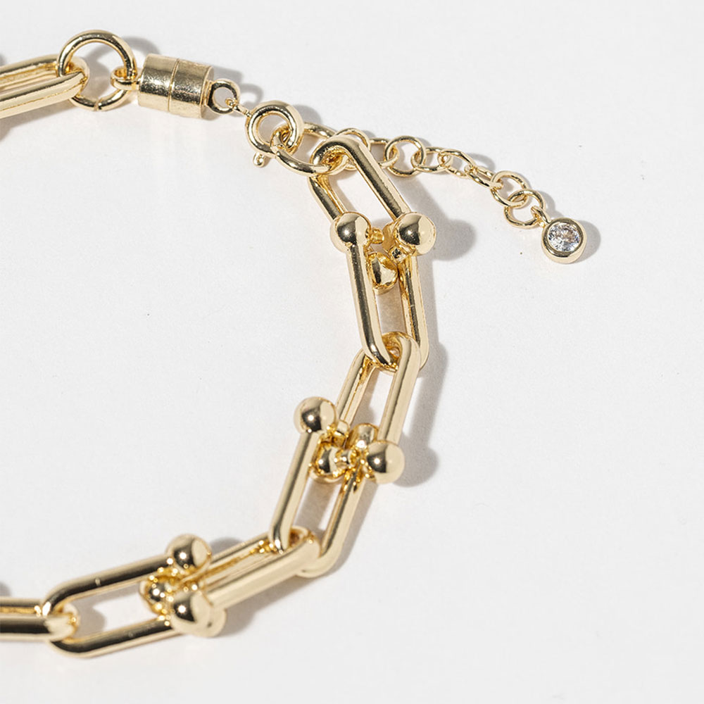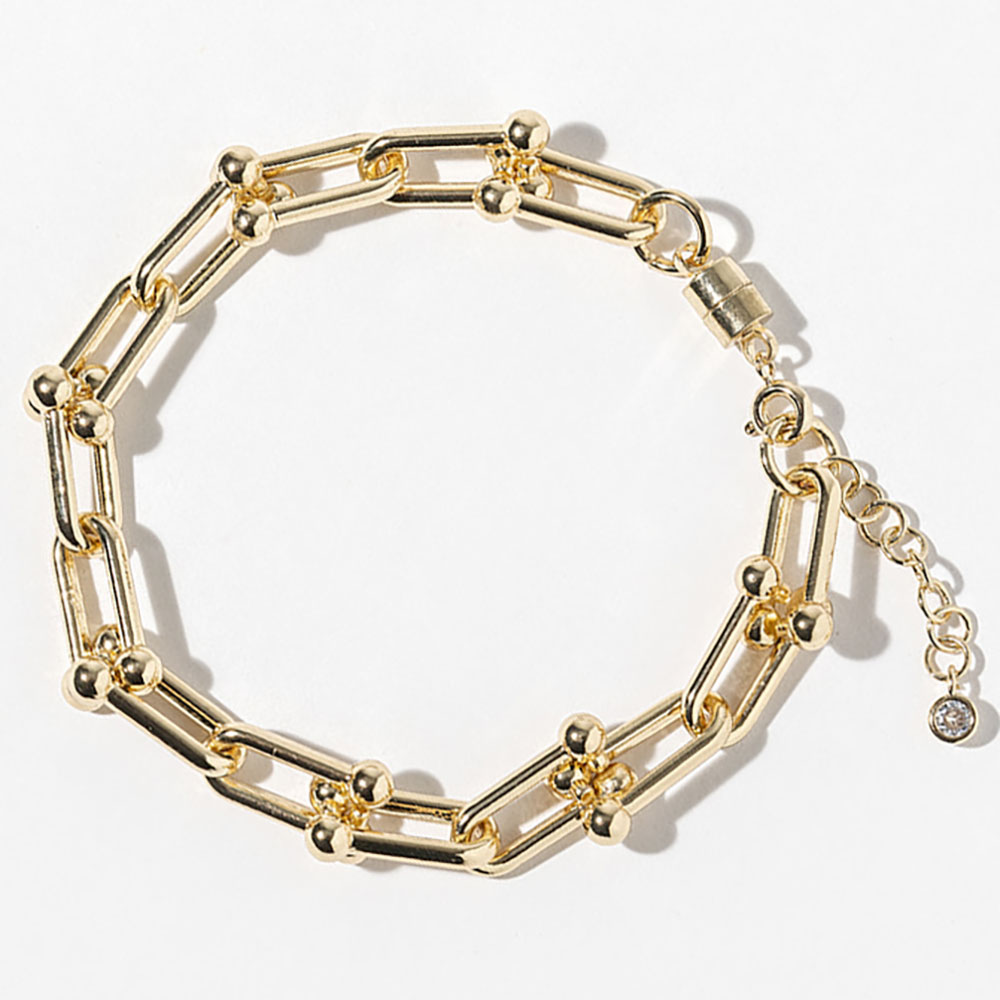 Details • Size : 0.3" H, 7.25" + 1" L • Magnetic Lobster Clasp Closure • Trendy beaded link chain bracelet featuring a sleek magnetic clasp for easy wear. Its bold geometric design and textured detailing add a stylish statement to any outfit. Perfect for layering or wearing solo, this bracelet brings a modern edge and polished finish to your look. • Gold Dipped • Lead and Nickel Compliant • Made In Korea