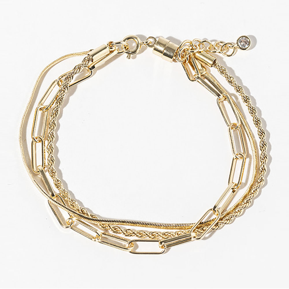 • Elegant layered bracelet featuring mixed link chains and a magnetic clasp for effortless style. The combination of sleek and twisted chains adds depth and texture, creating a chic statement piece perfect for daily wear or special occasions with a touch of modern sophistication.