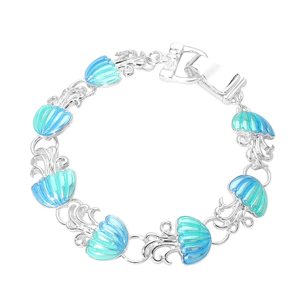 Details • Size : 0.5" H, 7" + 0.5" L • Magnetic Closure • This jellyfish charm bracelet showcases graceful jellyfish motifs linked with flowing details for an ocean-inspired statement. Designed for easy wear and comfortable styling, it adds playful movement to any look. Ideal for beach boutiques, resort collections, summer displays, and customers drawn to whimsical sea life jewelry with a unique, eye-catching appeal. • Lead and Nickel Compliant