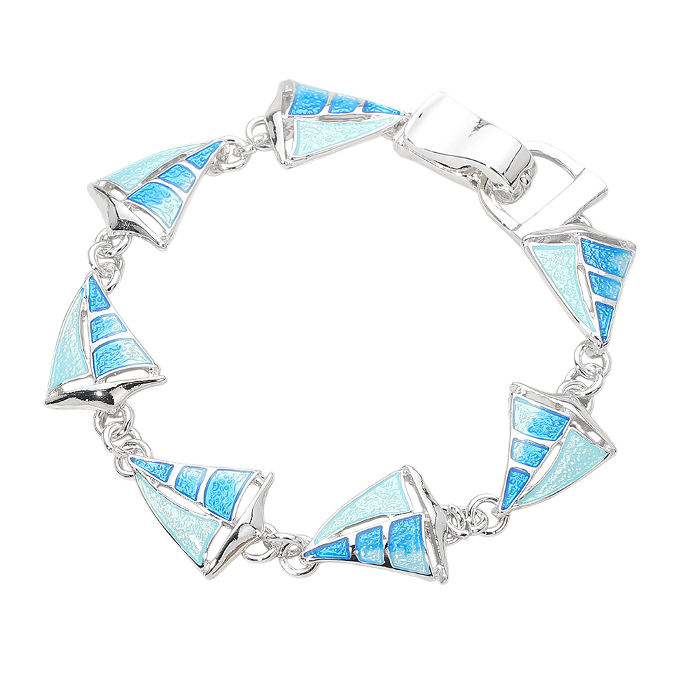 Details • Size : 0.6" H, 7" + 0.5" L • Magnetic Closure • Nautical sailboat charm bracelet designed with linked sail motifs that create a playful, seaside-inspired look. Ideal for beach boutiques, resort shops, cruise gift stores, and summer collections, this bracelet brings a breezy coastal feel to everyday wear and vacation-ready styling. • Lead and Nickel Compliant