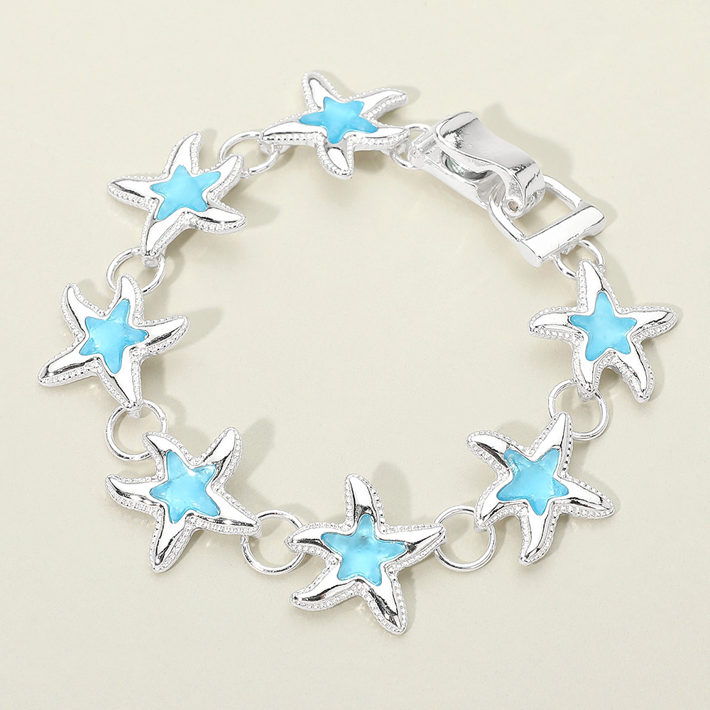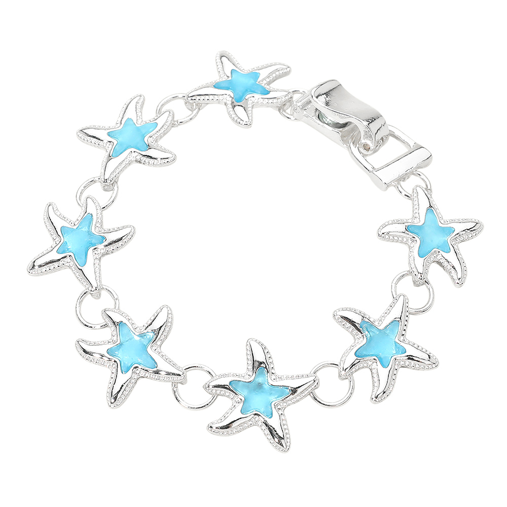 Details • Size : 0.75" H, 7" + 0.5" L • Magnetic Closure • Whimsical starfish charm bracelet designed with linked ocean-inspired shapes and a convenient magnetic clasp for easy wear. Perfect for beach themes, summer collections, and gift assortments, this playful bracelet adds a fun, seaside touch to everyday styling and seasonal jewelry displays. • Lead and Nickel Compliant