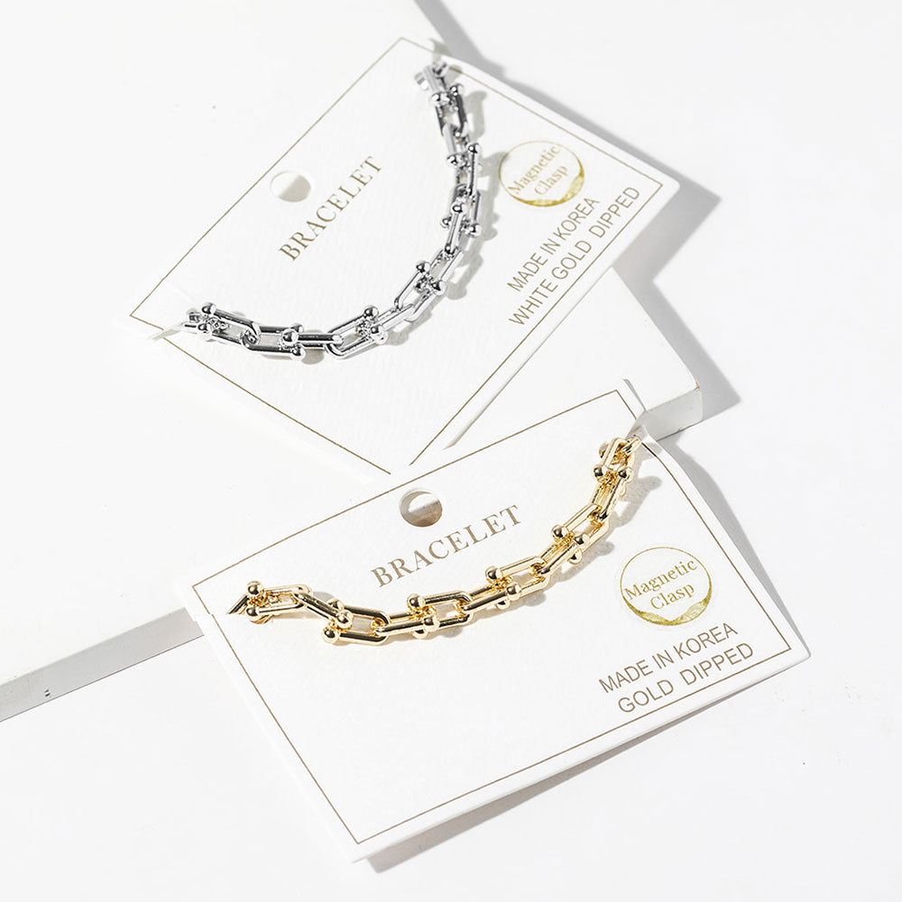 • Enhance your everyday style with this geometric link bracelet featuring delicate beaded accents and a secure clasp closure. Its modern chain design adds a touch of sophistication, making it a versatile accessory for casual looks or elegant evening wear.