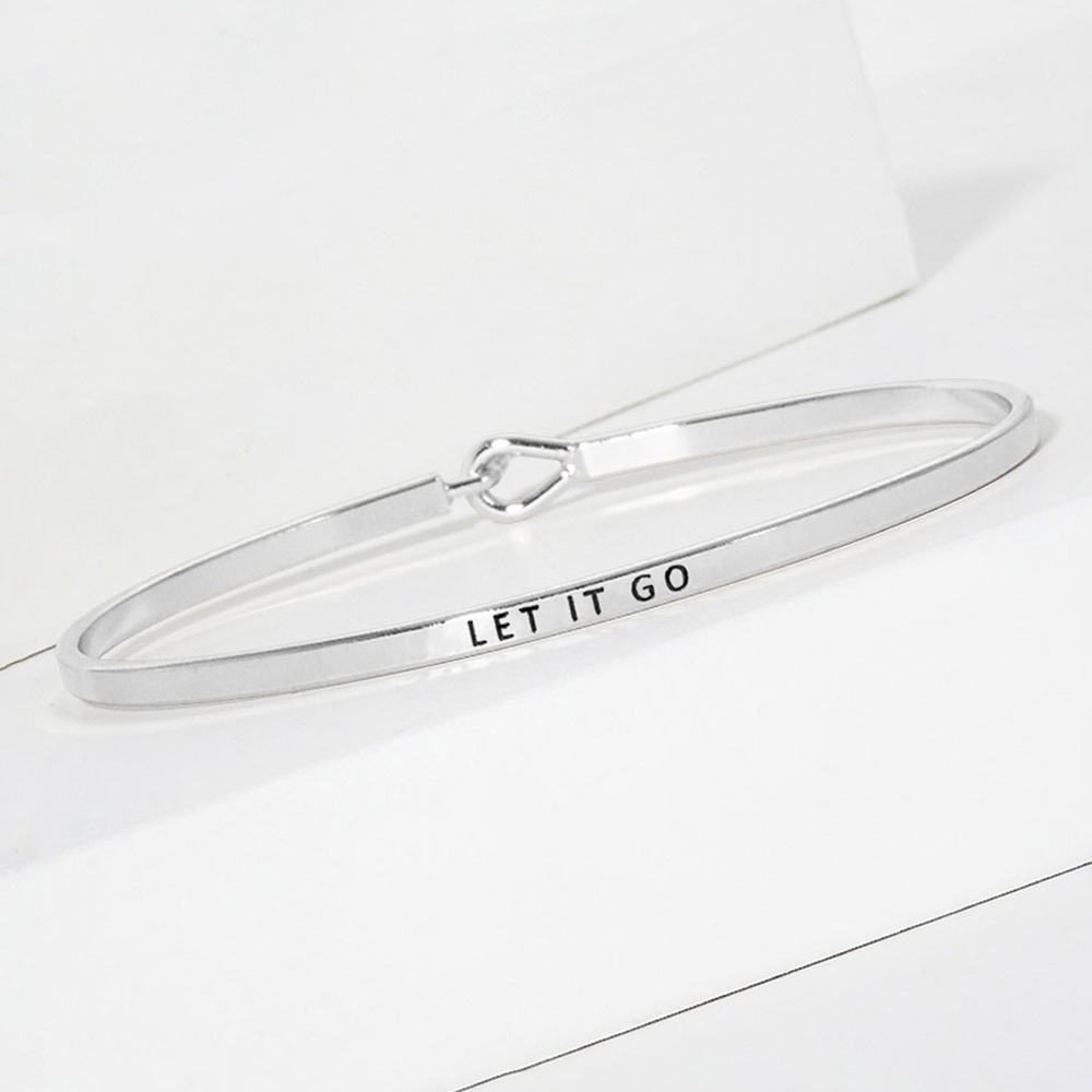 Details • Size : 0.2" H, 2.5" D • Hook Closure • Stay inspired with this minimalist bangle bracelet engraved with the motivational phrase “Let It Go.” Featuring a sleek and modern design, it’s perfect for daily wear or gifting. The secure hook closure ensures a comfortable fit while delivering a powerful reminder. • Brass • Lead and Nickel Compliant