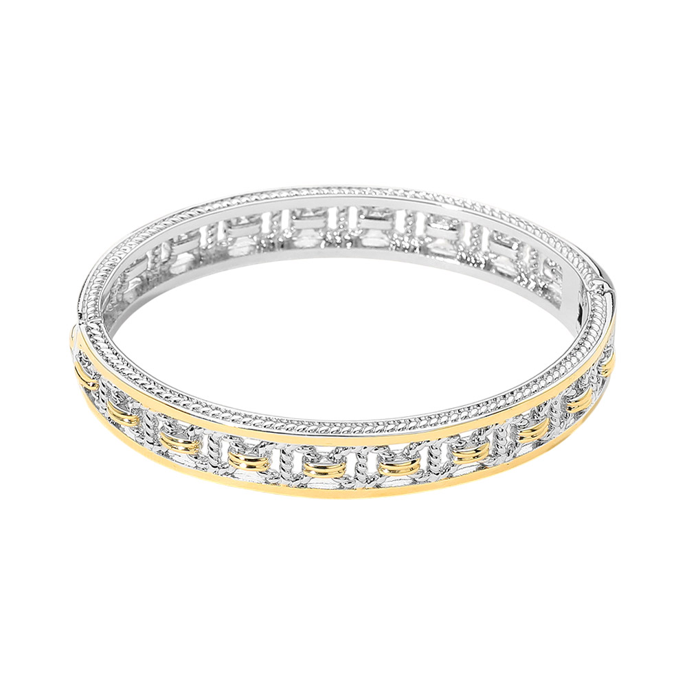 Details • Size : 0.3" H, 2.4" D • Hinged Closure • Elegant hinged bangle bracelet designed with textures and repeating chain-style accents for a refined, dimensional look. Structured silhouette offers a secure and comfortable fit, perfect for everyday wear or stacking. A versatile jewelry piece ideal for boutiques seeking timeless yet modern statement accessories. • Gold Dipped