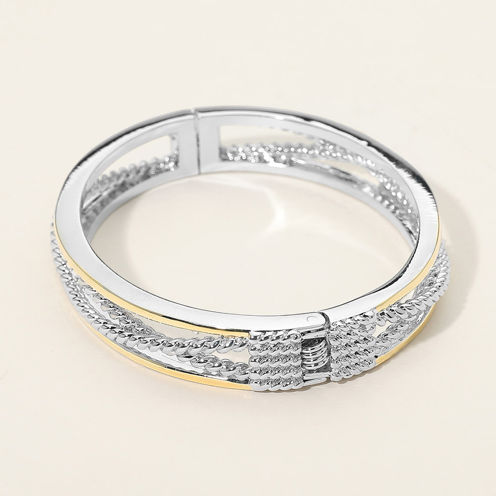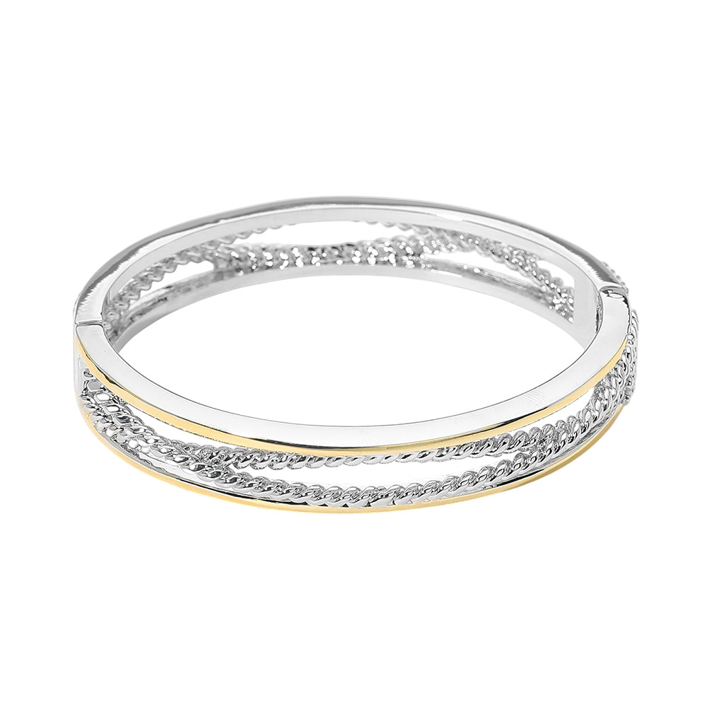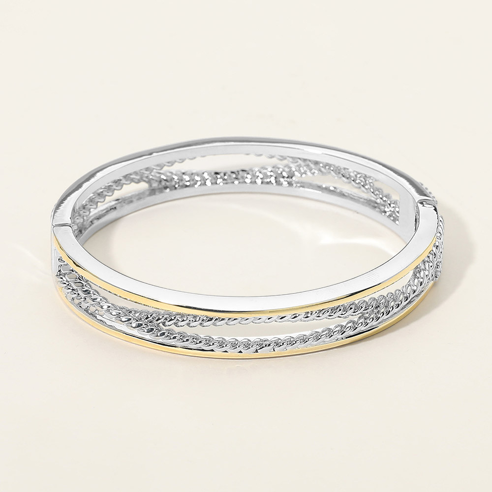 Details • Size : 0.4" H, 2.4" D • Hinged Closure • Elegant hinged bangle bracelet featuring layered rope-inspired textures and a sleek, polished silhouette for a refined everyday look. Designed for a secure, comfortable fit, it works beautifully worn alone or stacked with other styles. A versatile jewelry essential ideal for boutiques seeking timeless, modern accessories. • Gold Dipped