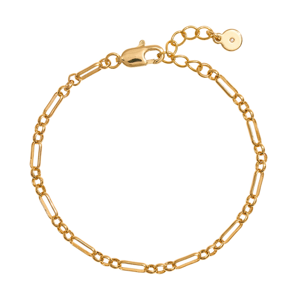 Details • Size : 0.2" H, 7" + 1.5" L • Lobster Clasp Closure • This double link chain bracelet blends classic simplicity with refined detail. Featuring alternating elongated and round links, it offers a lightweight yet stylish design. Perfect for layering with other favorites or wearing alone for a sleek, timeless statement. • Brass • Gold Dipped • Hypoallergenic • Made In Korea