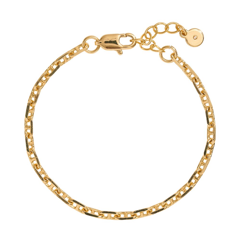 Details • Size : 0.2' H, 7" + 1.5" L • Lobster Clasp Closure • This sleek chain link bracelet offers a modern twist on a timeless design. Its refined links create a polished look that complements both everyday outfits and dressier styles. With an adjustable fit and elegant detailing, it’s a versatile accessory for any occasion. • Brass • Gold Dipped • Hypoallergenic • Made In Korea