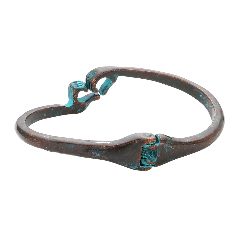 Details • Size : 0.6" H, 2.5" D • Hinged Closure • Celebrate love and artistry with this rustic heart hands metal bangle bracelet. Designed with a creative hand-shaped heart centerpiece and an antique-inspired finish, it adds a meaningful touch to any outfit. Perfect for gifting or expressing timeless affection in style. • Lead and Nickel Compliant