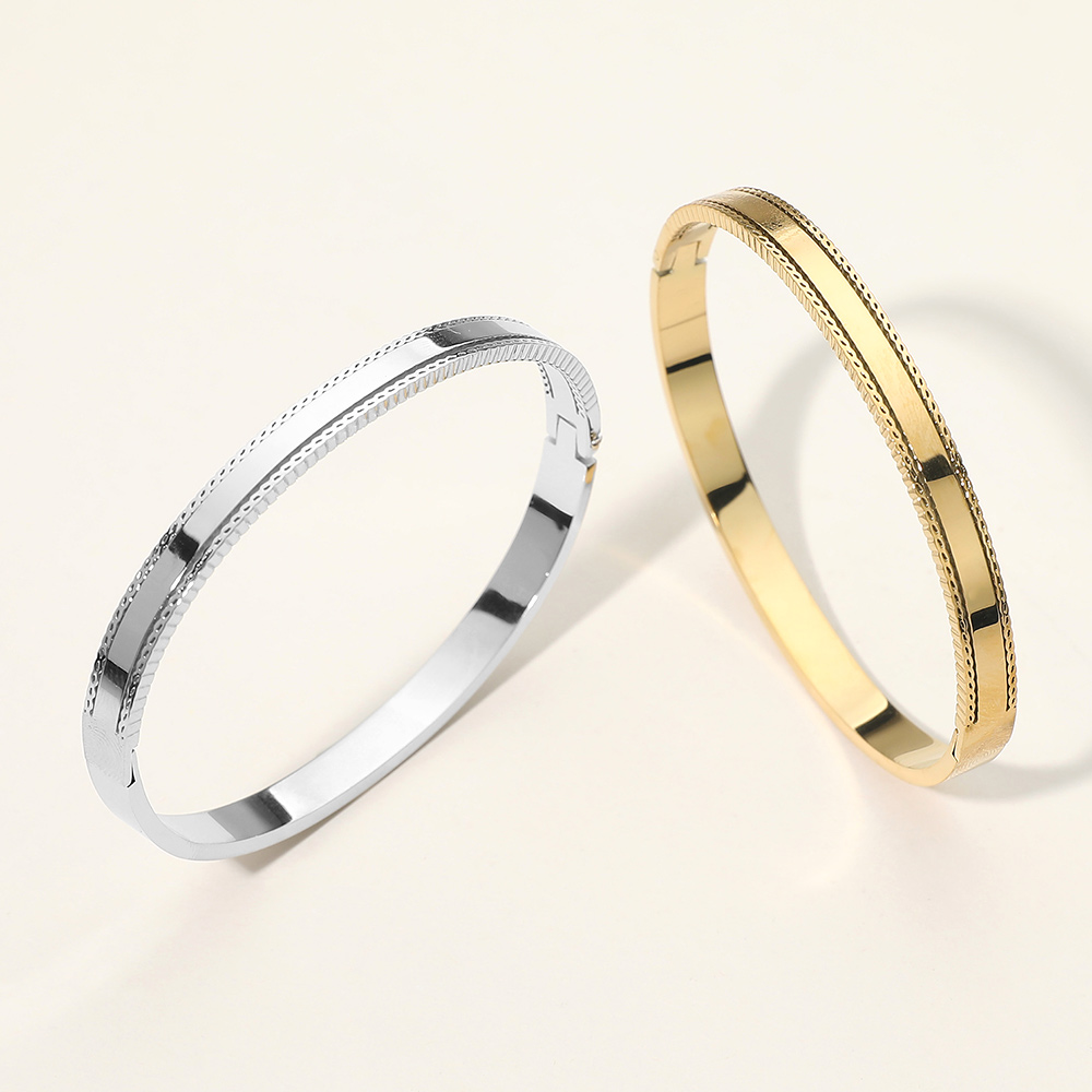 • Sleek hinged bangle bracelet designed with a smooth polished surface and refined textured edge for subtle detail. Comfortable to wear and easy to style, it works beautifully alone or layered with other bracelets. Ideal for everyday wear, work outfits, gifting, and timeless accessory collections.