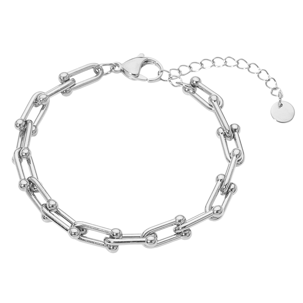 Details • Size : 0.3" H, 7.5" + 2.25" L • Lobster Clasp Closure • This stainless steel industrial link chain bracelet features a sleek, structured design accented with subtle rounded details for added dimension. Designed for everyday wear, it offers a refined statement that pairs effortlessly with casual or elevated looks. Perfect for stacking or wearing solo, it brings a clean, contemporary touch to any jewelry assortment. • Stainless Steel