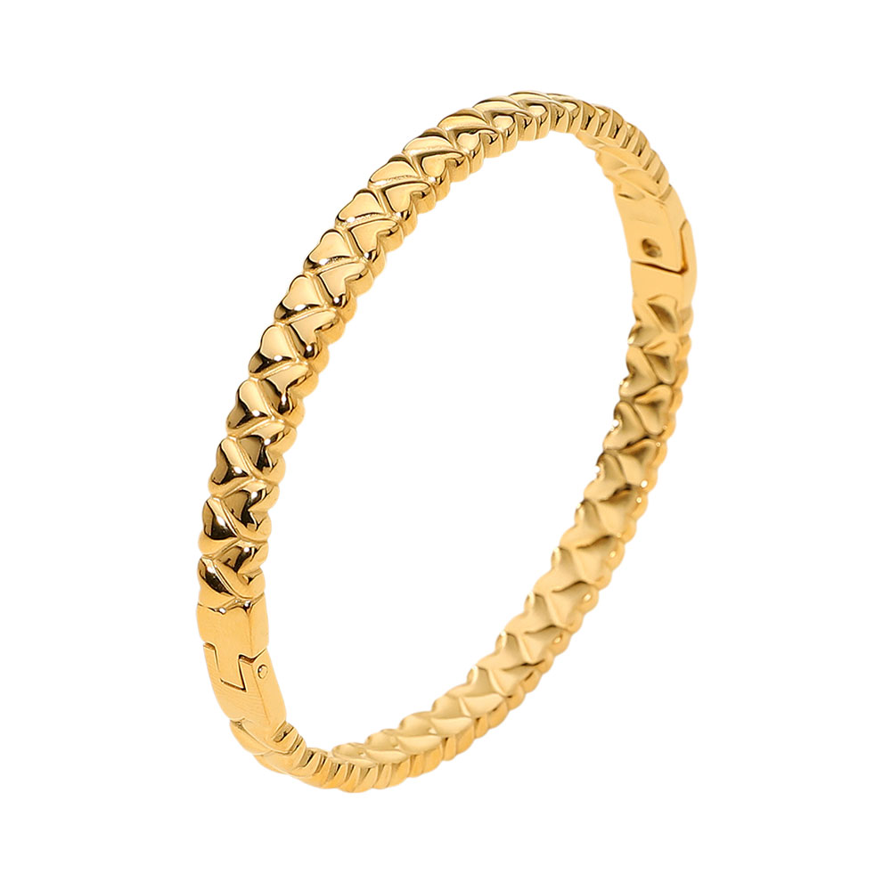 Details • Size : 0.25" H, 2.4" D • Hinged Closure • Water & Tarnish Resistant • Sleek hinged bangle featuring a continuous textured surface that adds dimension and subtle shine to any look. Designed for easy wear and a secure fit, this refined bracelet layers beautifully or stands alone as a modern statement for everyday styling. • Stainless Steel