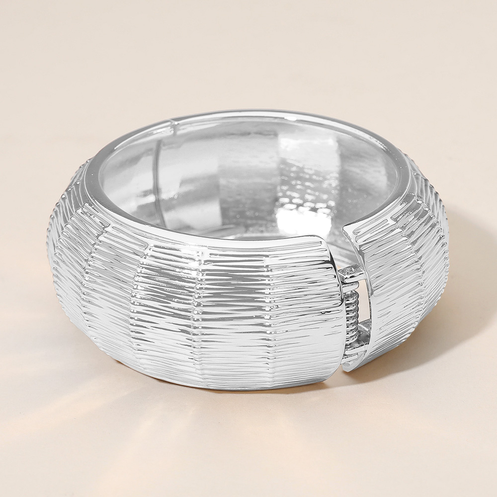 Details • Size : 1.25" H, 2.3" D • Hinged Closure • Make a bold impression with this textured wide bangle bracelet featuring a sleek, eye-catching design. Perfect for elevating casual or dressy outfits, this statement piece adds a touch of modern elegance and sophistication to your accessory collection.