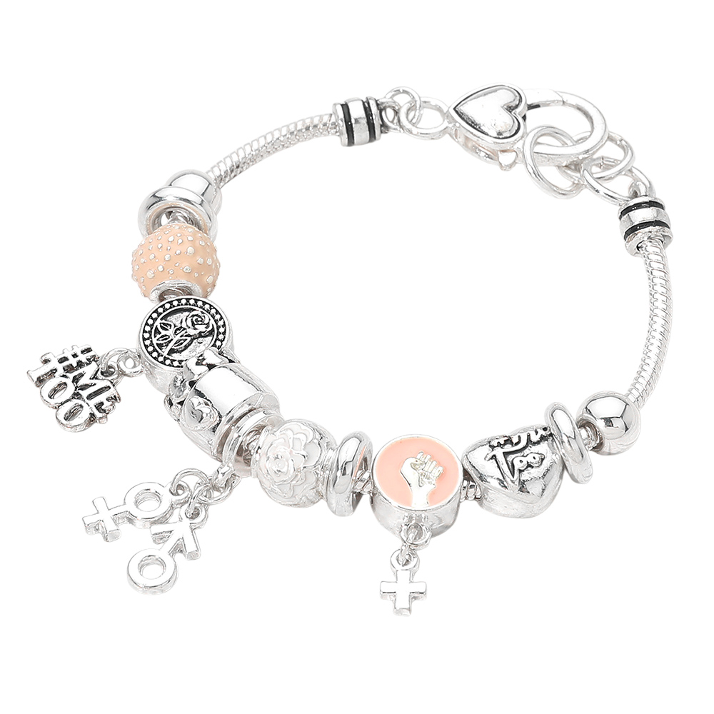 Details • Size : 0.7" H, 8" + 0.5" L • Clasp Closure • Meaningful charm bracelet featuring empowerment symbols, heart details, and decorative beads that celebrate strength, equality, and self expression. Designed for everyday wear or thoughtful gifting, this statement accessory adds purpose and personality to layered bracelet styles or solo looks. • Lead and Nickel Compliant