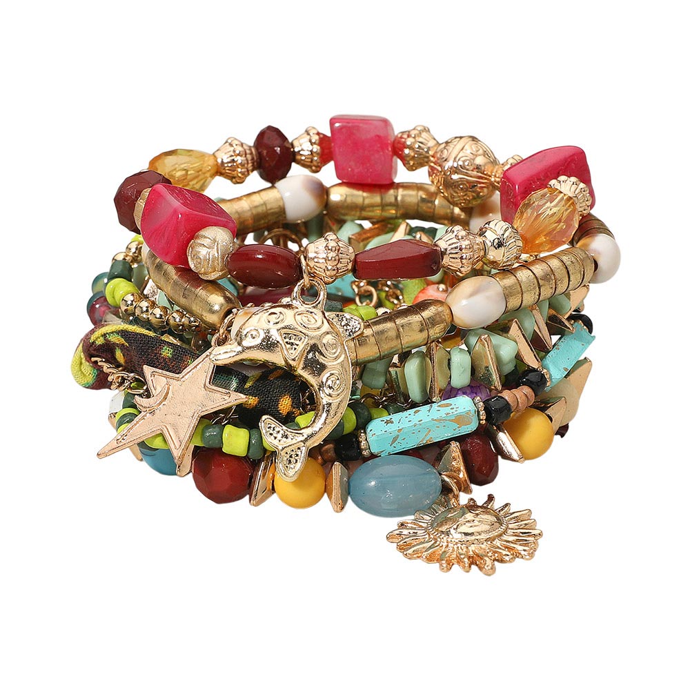 • Boho dolphin star sun charm bracelet set featuring layered beaded strands with bold shapes, textured accents, and playful ocean-inspired motifs including a dolphin, star, and sun. Designed for stacking and stylish everyday wear, adding a vibrant artisan touch to casual outfits, festivals, vacations, and gifting occasions.