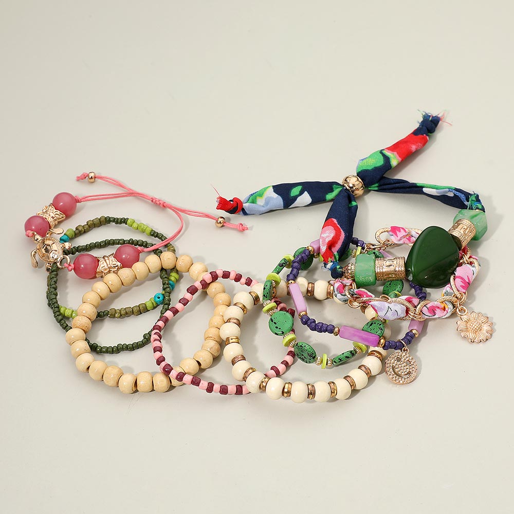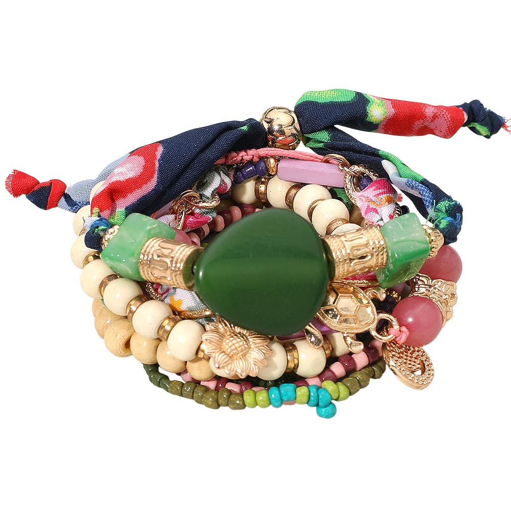 Details • Size 1 : 1.5" H / Stretchable • Size 2 : 1.5" H / Adjustable • Size 3 : 0.4" H, 7" + 2" L / Lobster Clasp Closure • Vibrant boho bracelet set featuring layered stretch designs with mixed beads, floral charm accents, and a colorful fabric tie for a playful stacked look. Lightweight and easy to wear, perfect for vacations, casual outfits, gifting, and adding a fun, eclectic touch to everyday style. • Lead and Nickel Compliant • Made In India