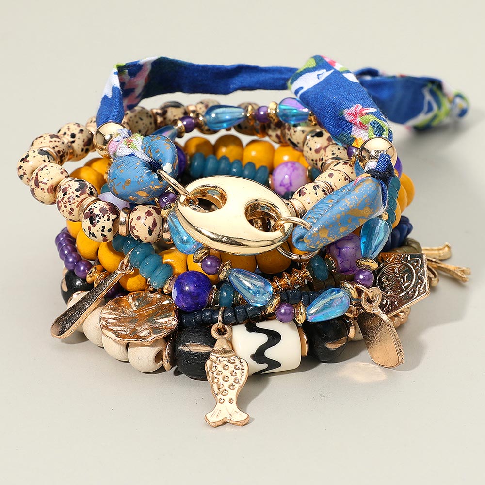 • A bold bracelet set featuring a lively mix of beads, playful charms, and patterned fabric accents. Designed for stacked styling, it adds effortless personality and movement to everyday looks while offering a fun, expressive accessory option.