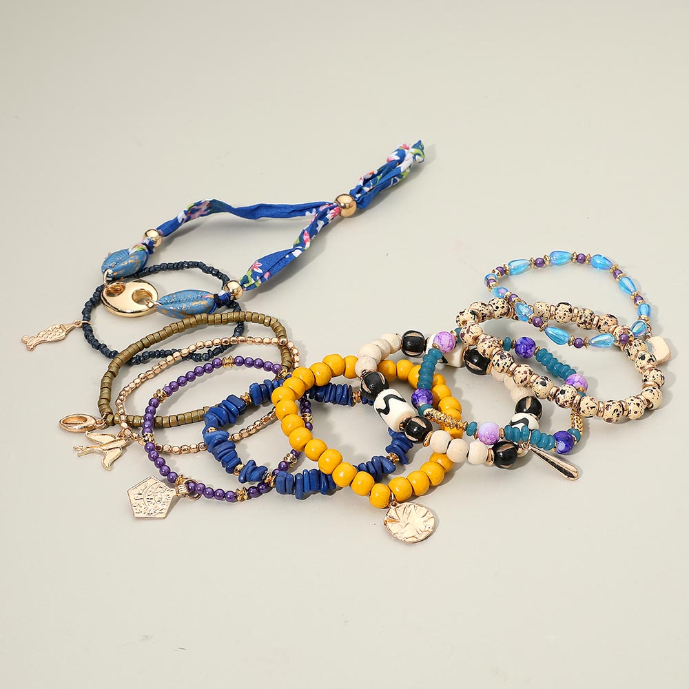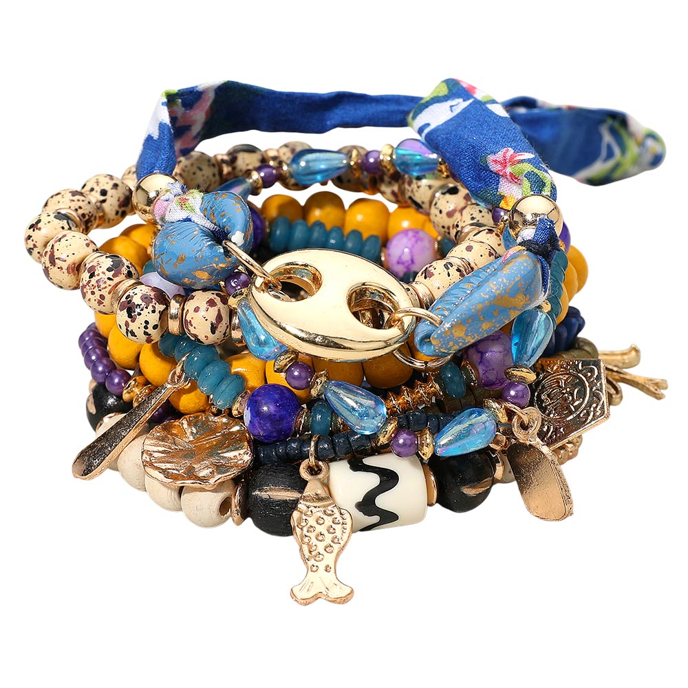 11PCS - Mixed Bird Fish Charm Beaded Stretch Adjustable Multi Layered Bracelets