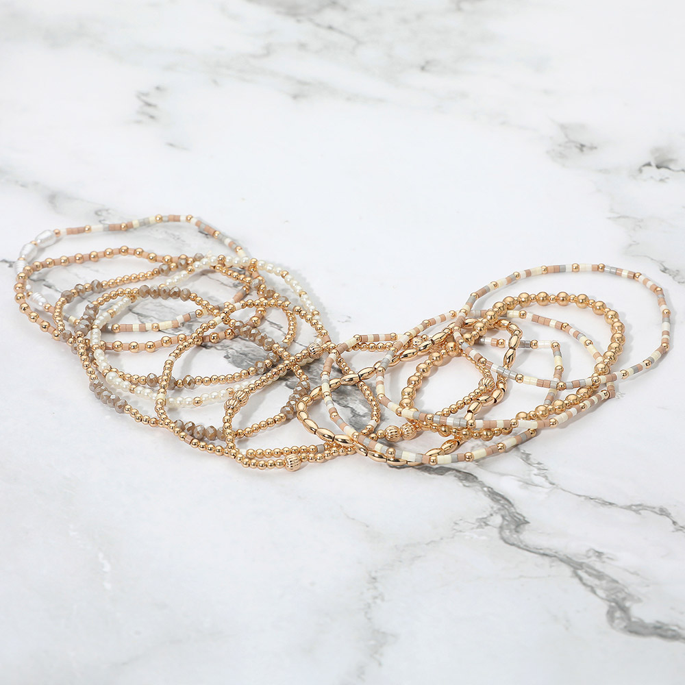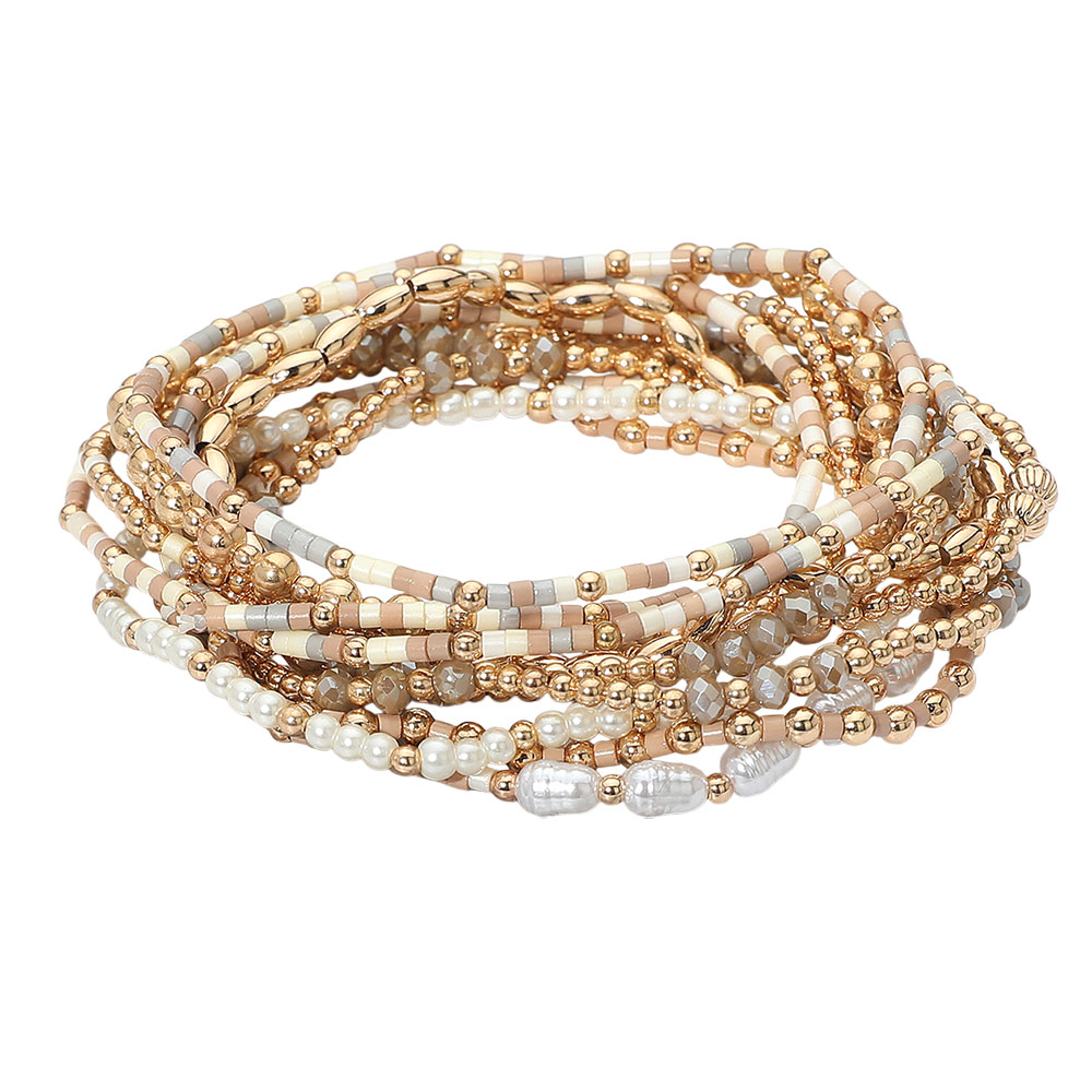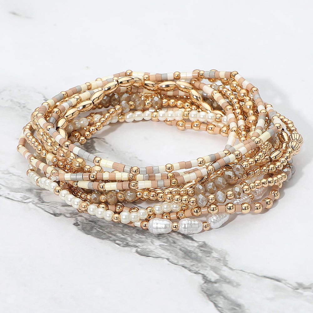 12PCS - Pearl Metal Ball Seed Faceted Beaded Stretch Multi Layered Bracelets