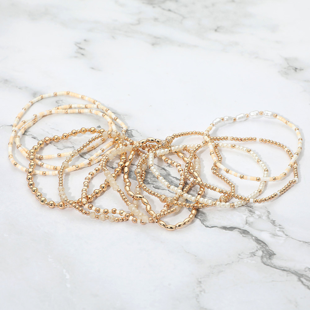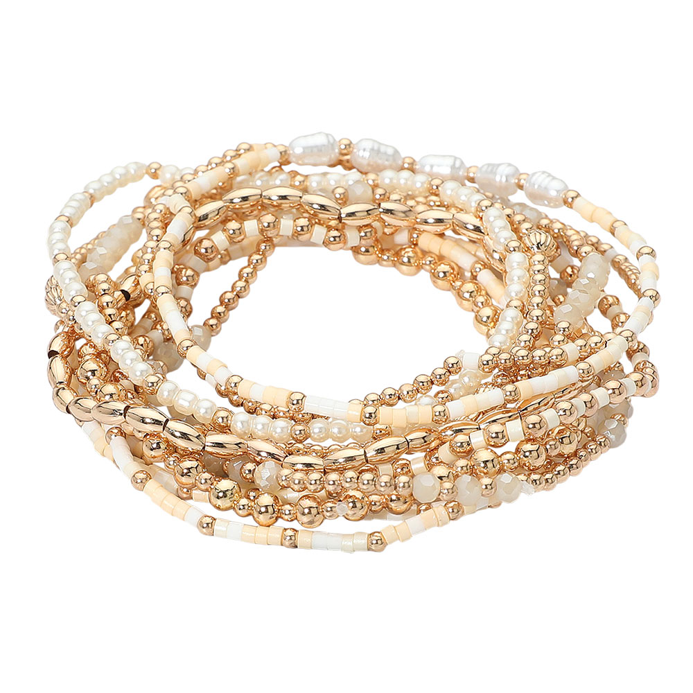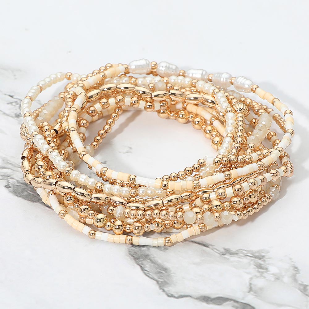 12PCS - Pearl Metal Ball Seed Faceted Beaded Stretch Multi Layered Bracelets
