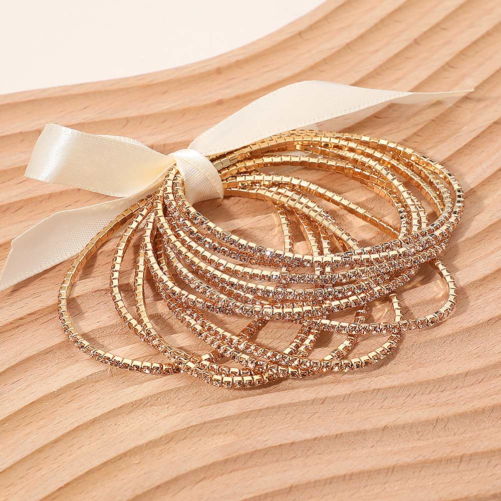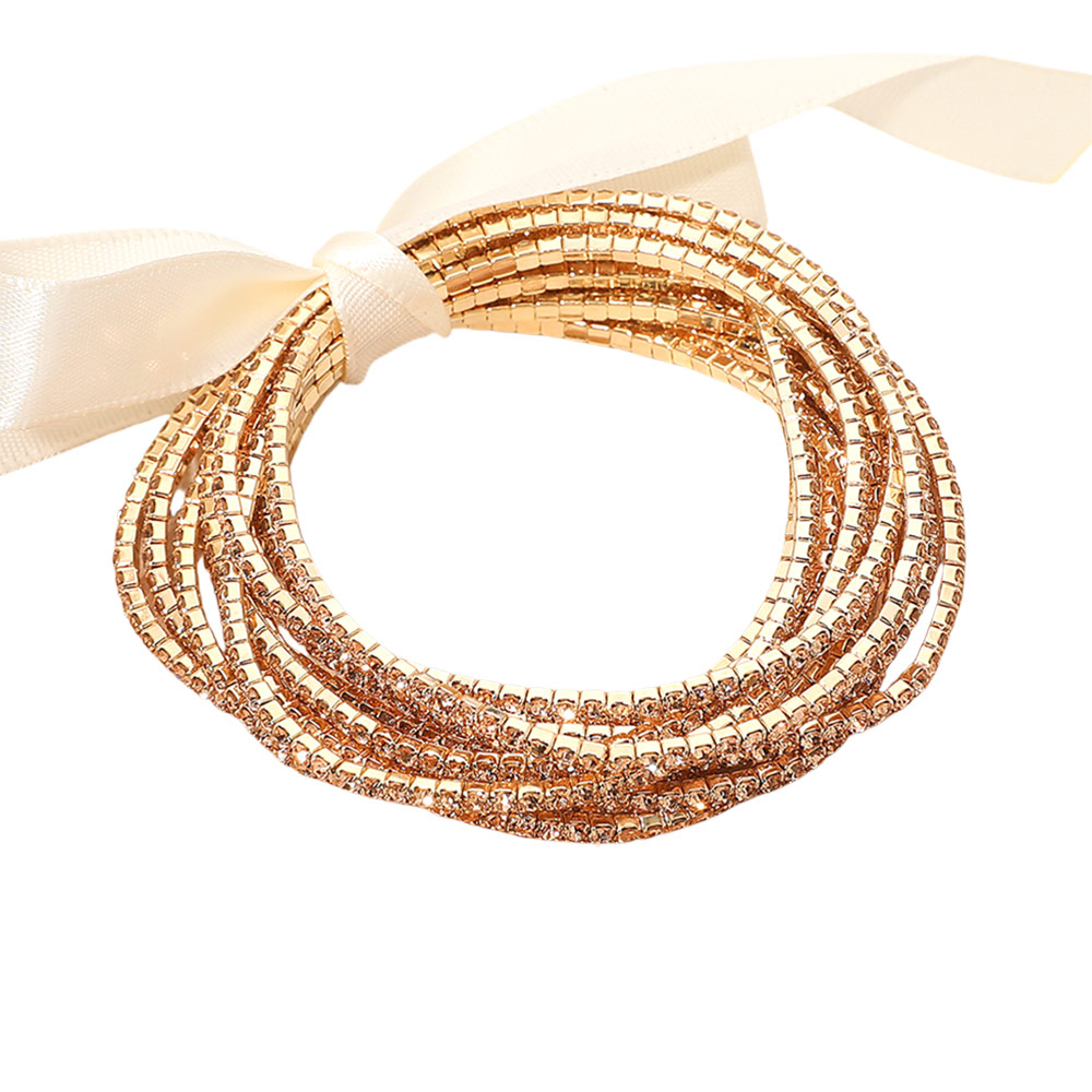 12PCS - Ribbon Slim Rhinestone Stretch Multi Layered Bracelet