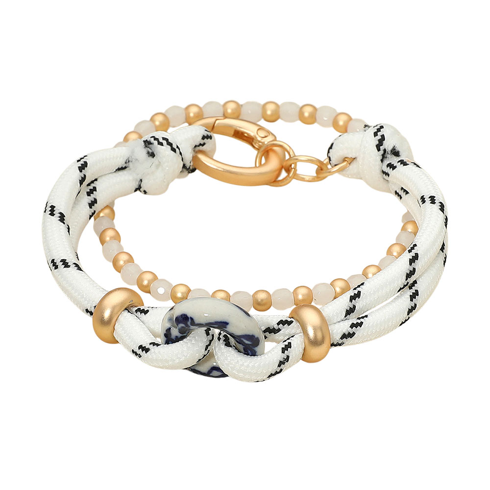 Details • Size 1 : 0.7" H, 8" L • Size 2 : 0.2" H, Stretchable • Trendy layered bracelet featuring a mix of rope and bead elements with an artistic accent detail. Designed for a casual yet stylish look, this accessory adds a unique touch to everyday outfits and is perfect for stacking or wearing as a standout piece. • Lead and Nickel Compliant