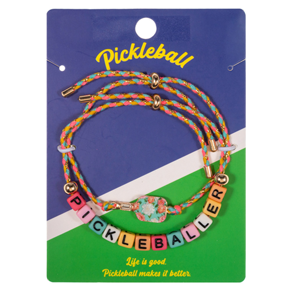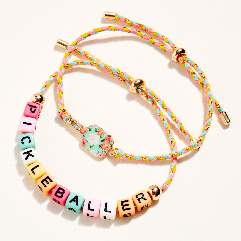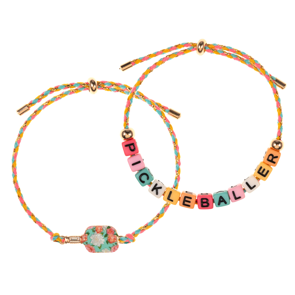 • This adjustable cord bracelet set features playful letter beads spelling pickleball along with a coordinating charm bracelet for a fun, sporty look. Designed for easy wear and flexible sizing, these bracelets are perfect for everyday stacking, pickleball enthusiasts, team gifts, and casual accessory collections with an active lifestyle theme.