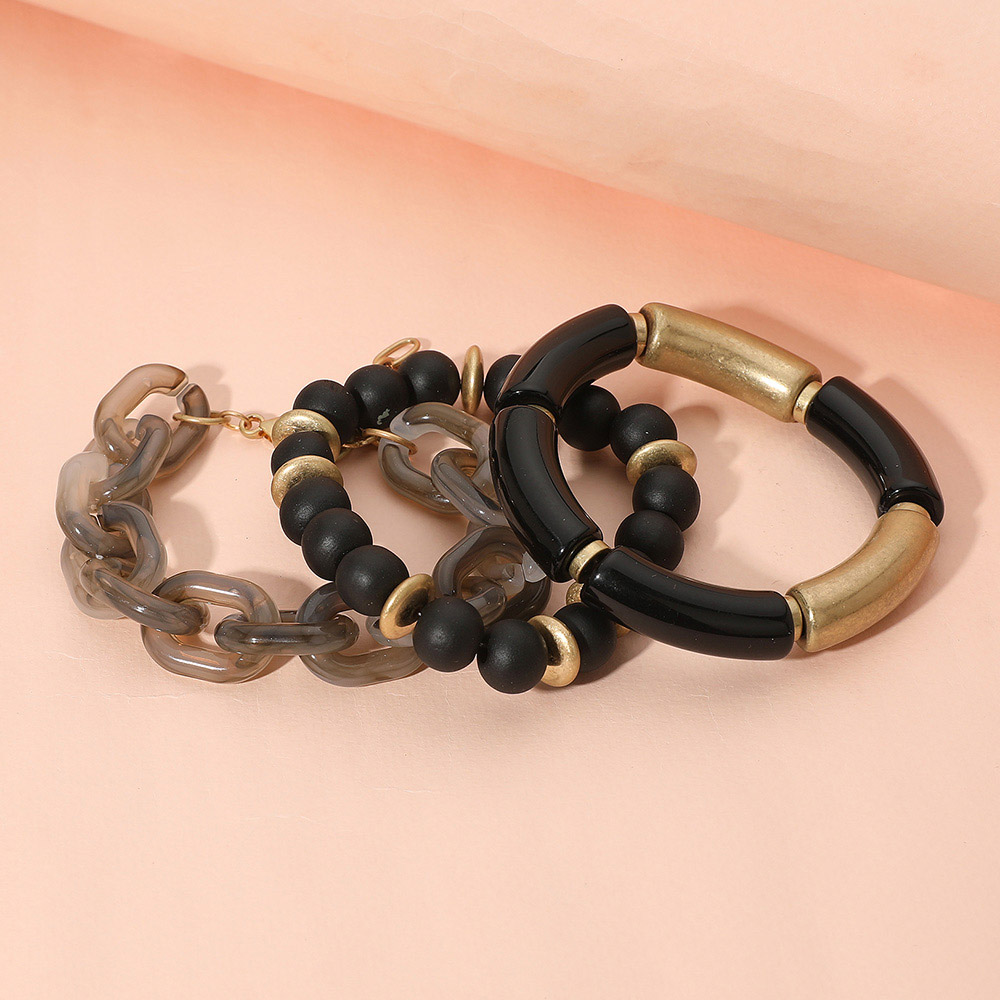 3PCS - Bold Wooden Mixed Beaded Stretch Resin Link Multi Layered Bracelets