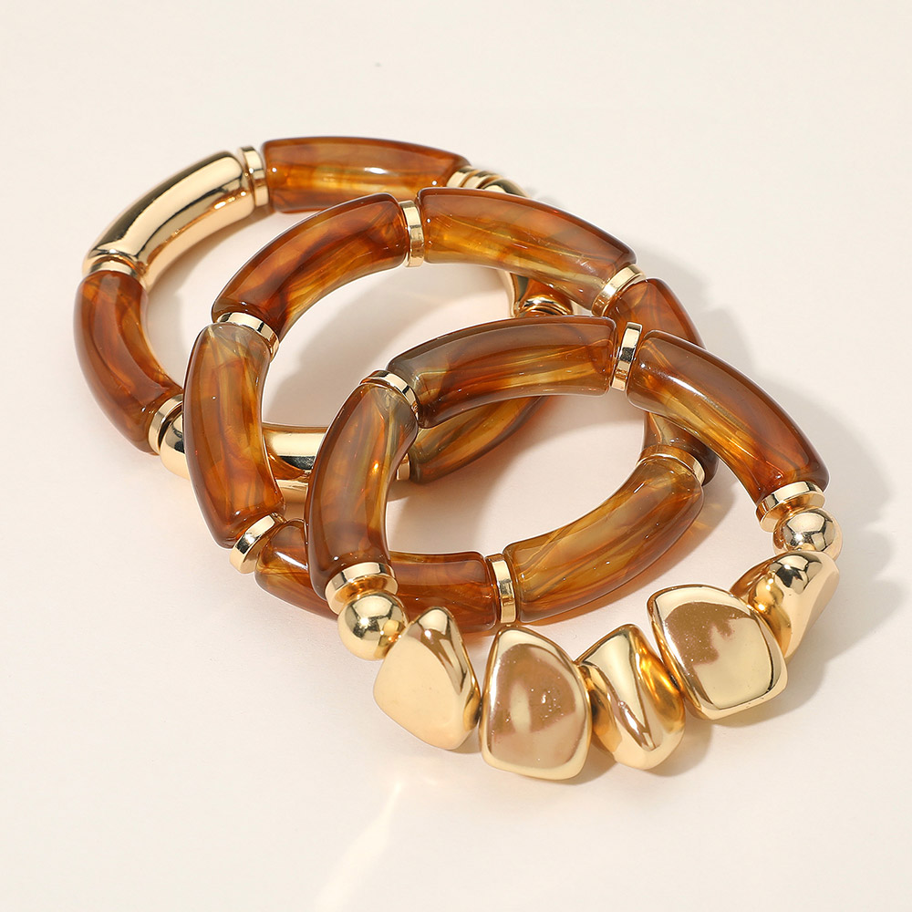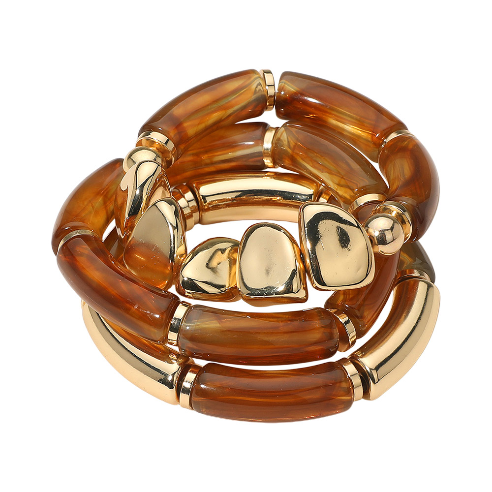Details • Size : 1.4" H • Stretchable • Add bold sophistication to your look with this triple-layer stretch bracelet featuring smooth resin links and polished metal accents. Its flexible fit and statement-making design make it the perfect accessory for casual wear, office style, or evening elegance. • Lead and Nickel Compliant