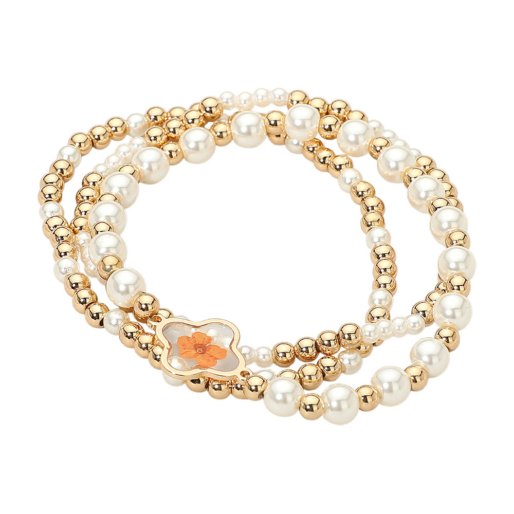 3PCS - Floral Accent Pearl Metal Ball Beaded Stretch Multi Layered Bracelets