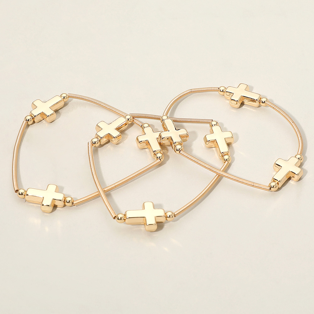 Details • Size : 1.25" H • Stretchable • A stylish multi-strand bracelet set featuring sleek cross charms arranged along flexible bands for an easy, layered look. Lightweight and versatile, it adds modern flair to casual or dressed-up outfits, making it a meaningful accessory that pairs effortlessly with any personal style. • Lead and Nickel Compliant