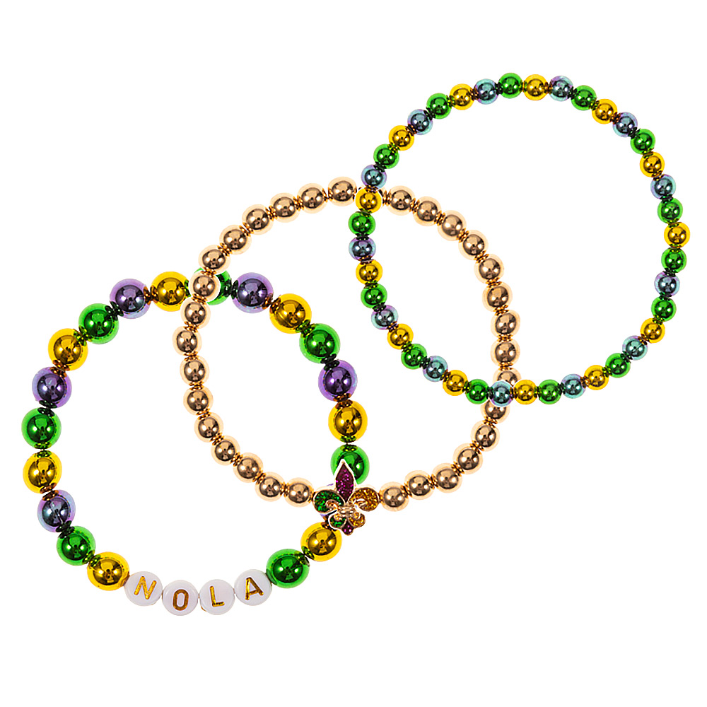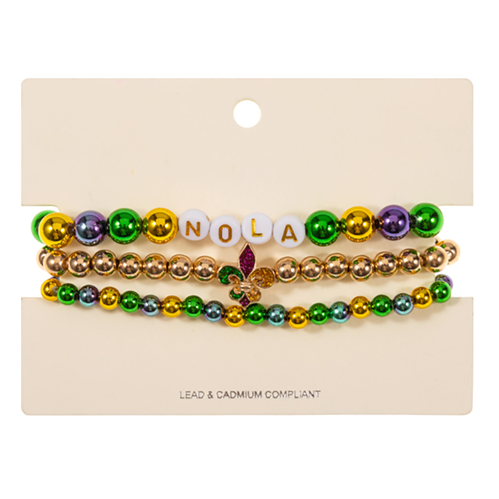 Details • Size : 1" H • Stretchable • Celebrate festive flair with this Mardi Gras bracelet set featuring metallic beads in vibrant hues and a “NOLA” letter accent. Complete with a decorative charm, this stretchy trio adds playful sparkle and cultural charm to any look, perfect for parades, parties, or everyday fun. • Lead and Nickel Compliant