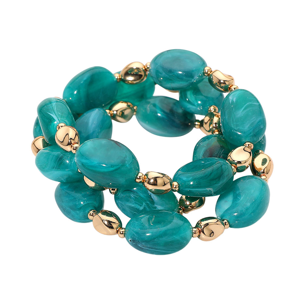 Details • Size : 1.5" H • Stretchable • This stretch bracelet showcases smooth oval beads arranged in a stacked, multi-row style for a bold yet refined look. Its sculpted shapes and polished accents create a striking accessory that adds effortless elegance to both everyday and elevated outfits. • Lead and Nickel Compliant
