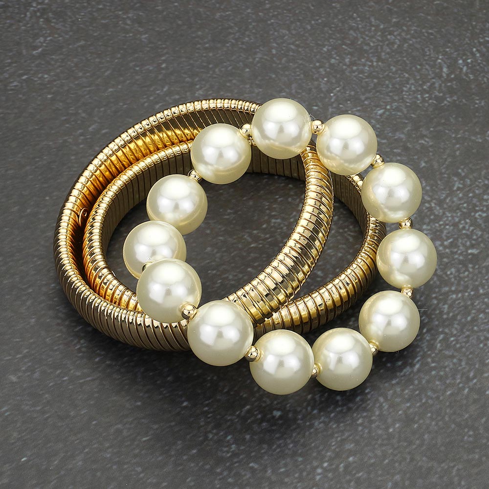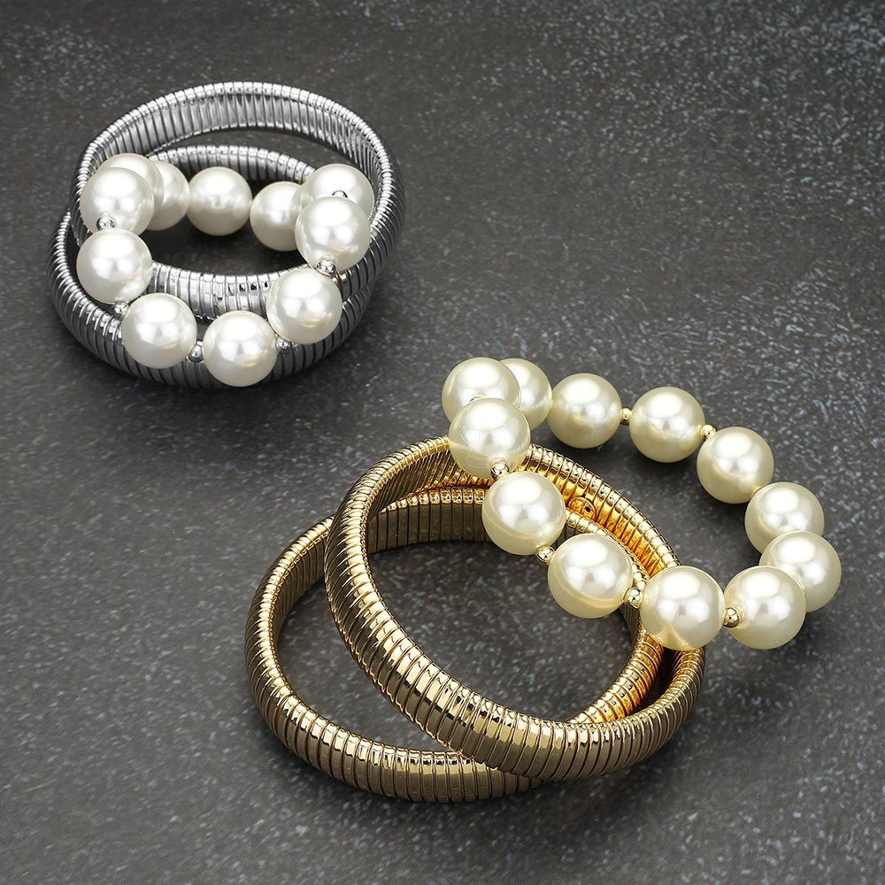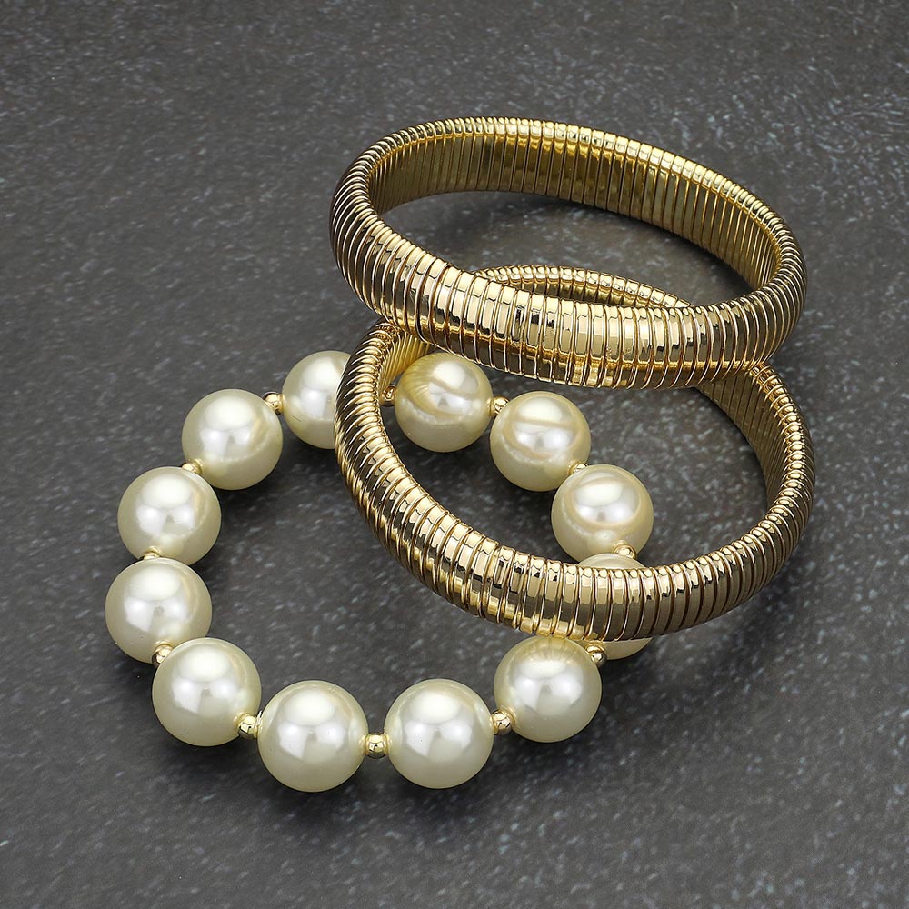Details • Size : 1.75" H • Stretchable • Enhance your jewelry collection with this pearl and metallic stretch bracelet set, featuring luminous pearls paired with sleek metallic bands. Designed for comfort and style, this versatile bracelet set transitions effortlessly from casual outfits to formal occasions with timeless sophistication. • Lead and Nickel Compliant
