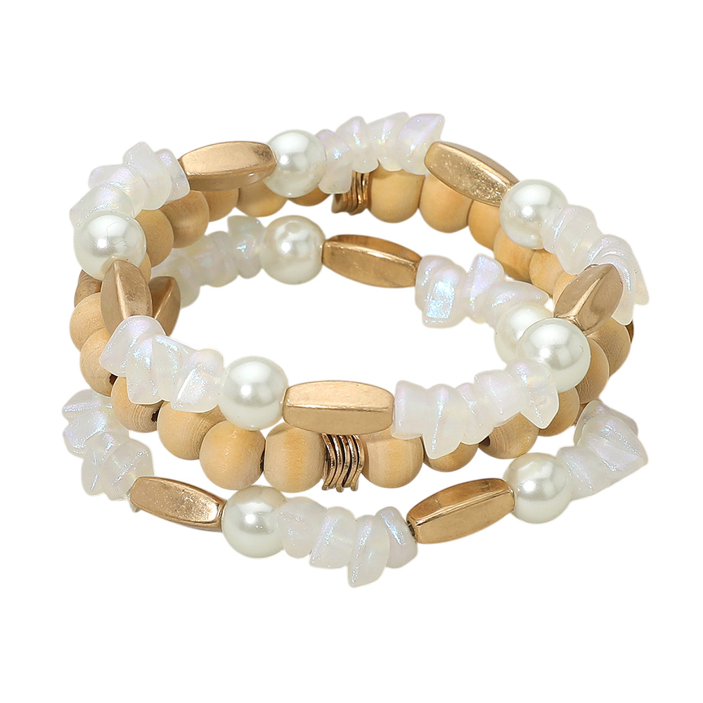 Details • Size : 1" H • Stretchable • Complete your look with this elegant beaded stretch bracelet set featuring smooth beads, shell-like chips, and metallic accents. Designed for easy layering or solo wear, this versatile bracelet adds a touch of sophistication to both everyday and special occasion outfits. • Lead and Nickel Compliant