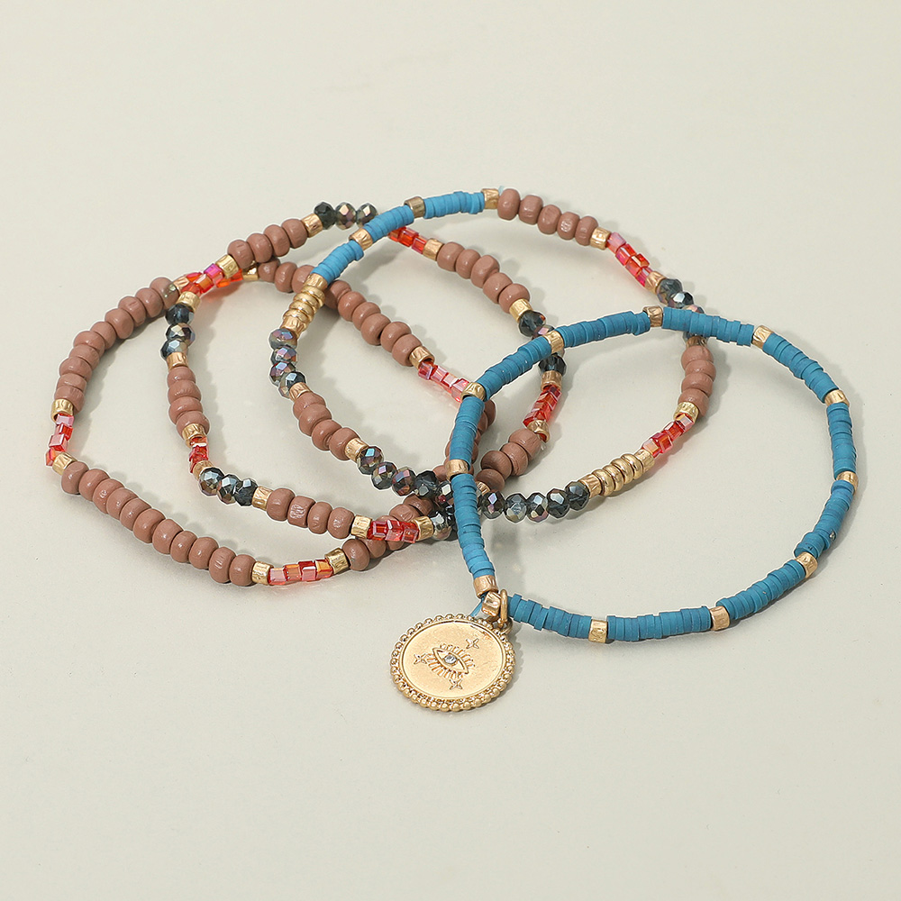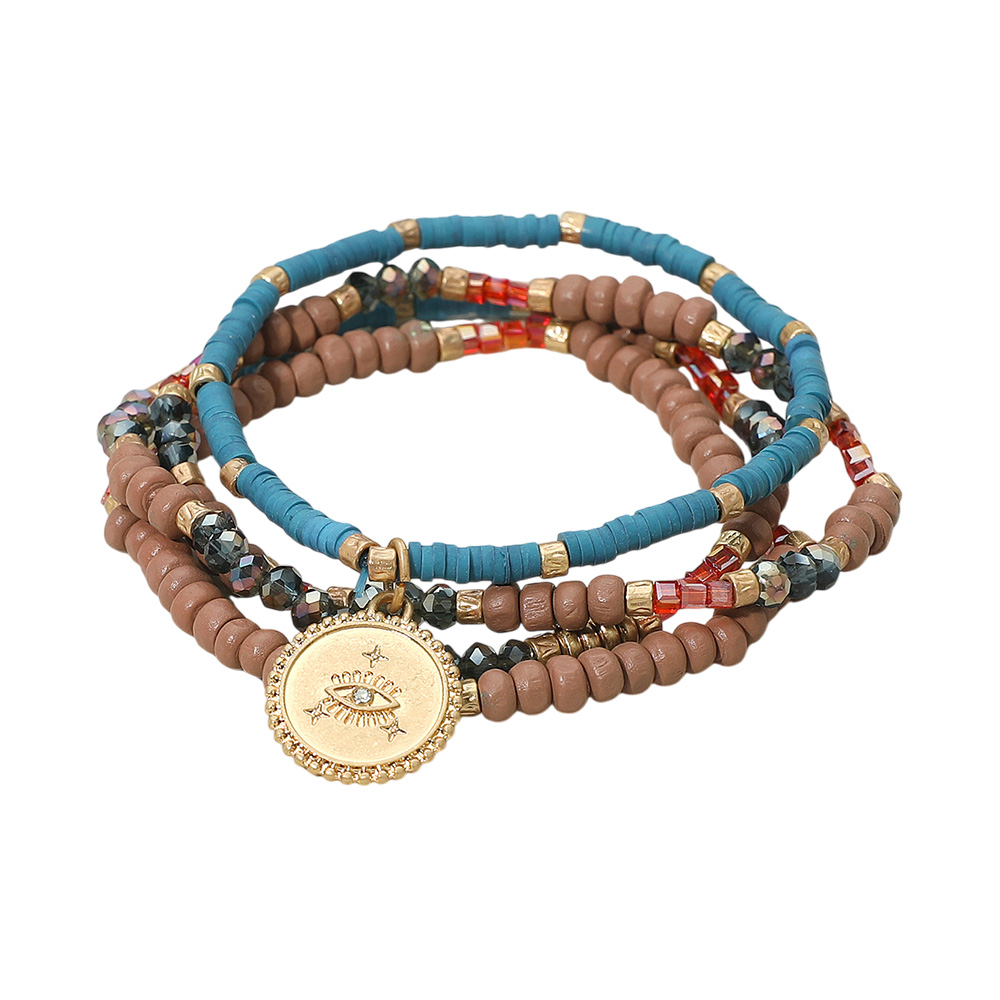 Details • Size : 0.75" H • Stretchable • This layered stretch bracelet set features a stylish mix of smooth and faceted beads accented with a round charm for added detail. Comfortable and versatile, it offers a unique boho-inspired look, perfect for stacking or wearing solo to elevate everyday outfits. • Lead and Nickel Compliant