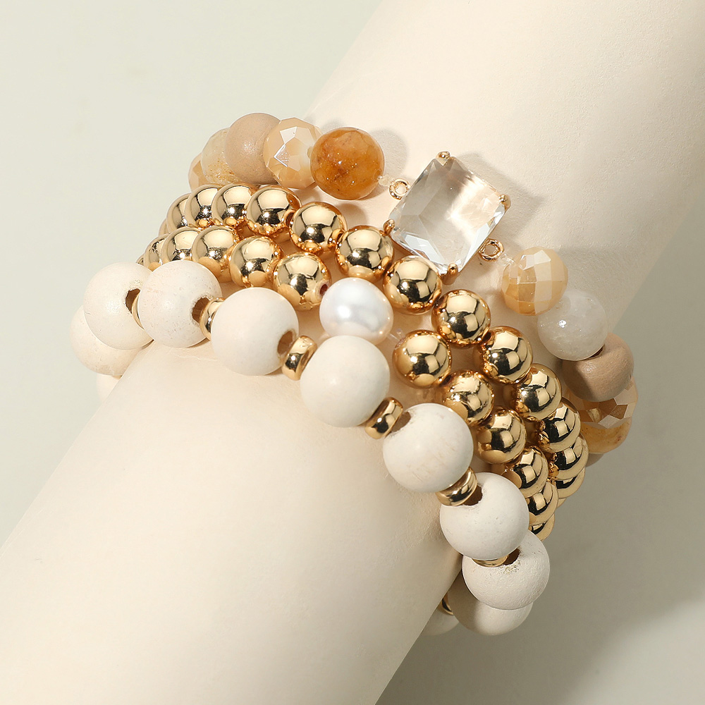 4PCS - Semi Precious Pearl Wood Beaded Stretch Bracelets